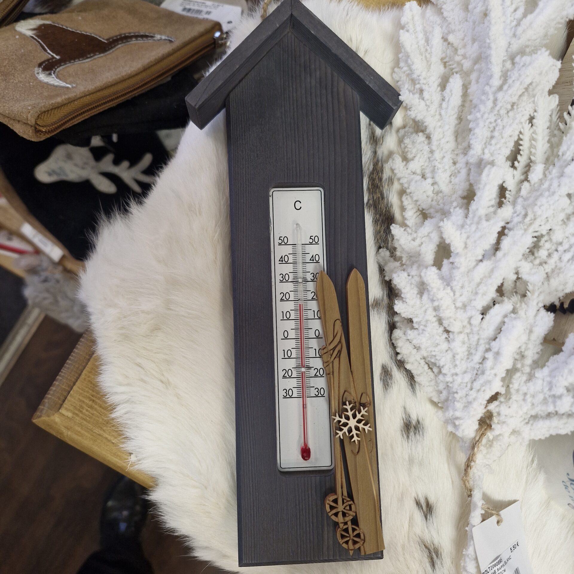 THERMOMETRE EN BOIS GRIS FORME MAISONNETTE DECOR SKIS FLOCON