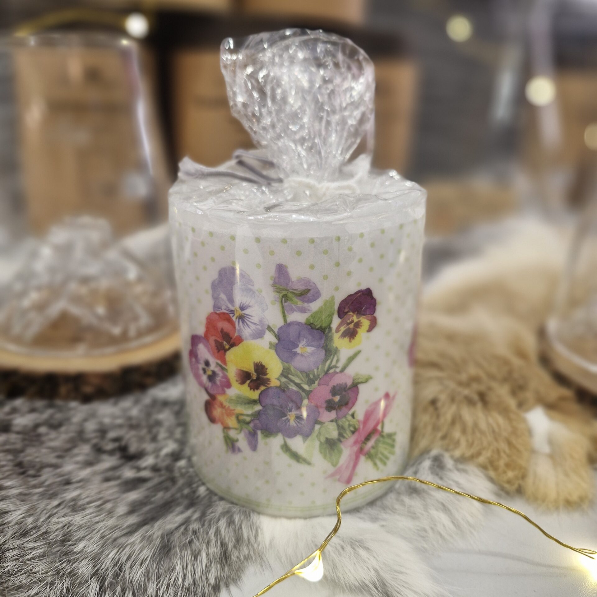 BOUGIE LAMPION PM BOUQUET DE VIOLETTES FOND BLANC ET POINTS VERTS