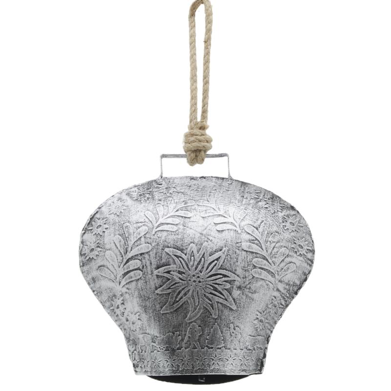 CLOCHE METAL GRIS AVEC EDELWEISS ET ANSE CORDE H15CM