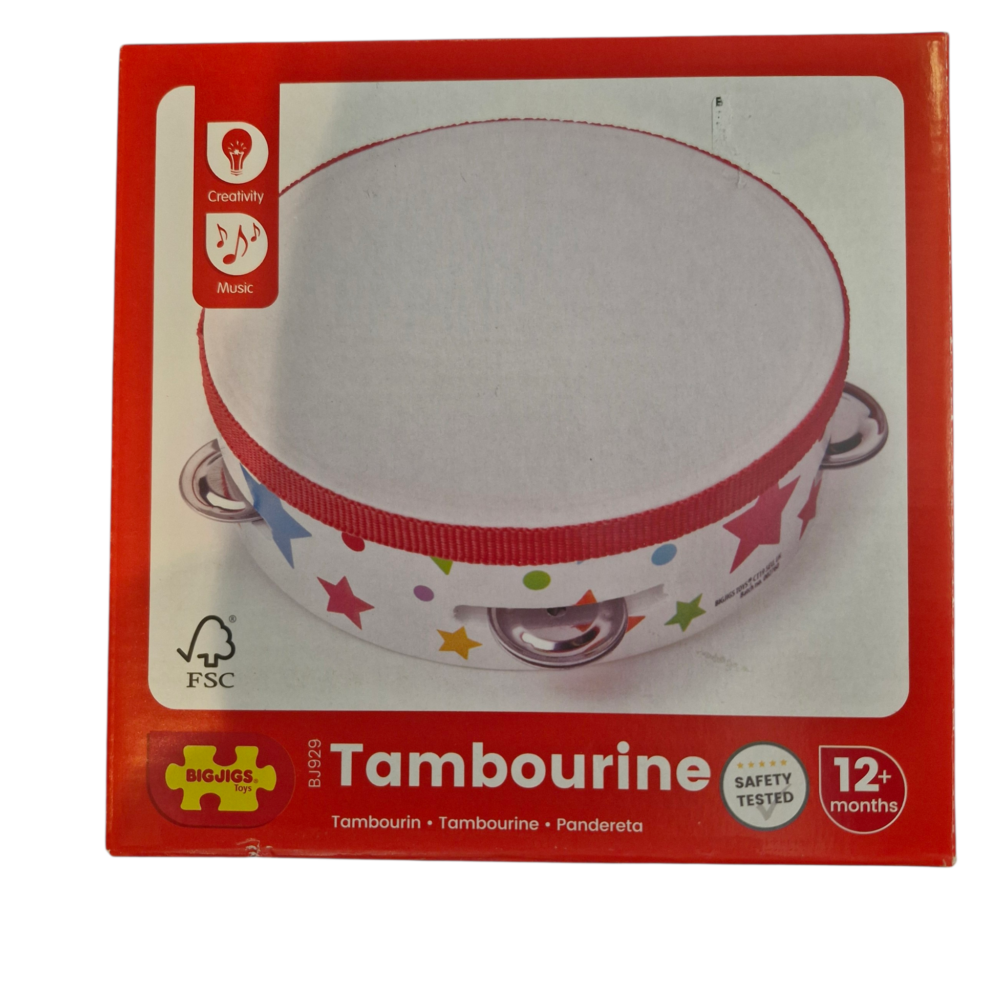 TAMBOURIN EN BOIS BLANC ET ROUGES AVEC ETOILES +12MOIS