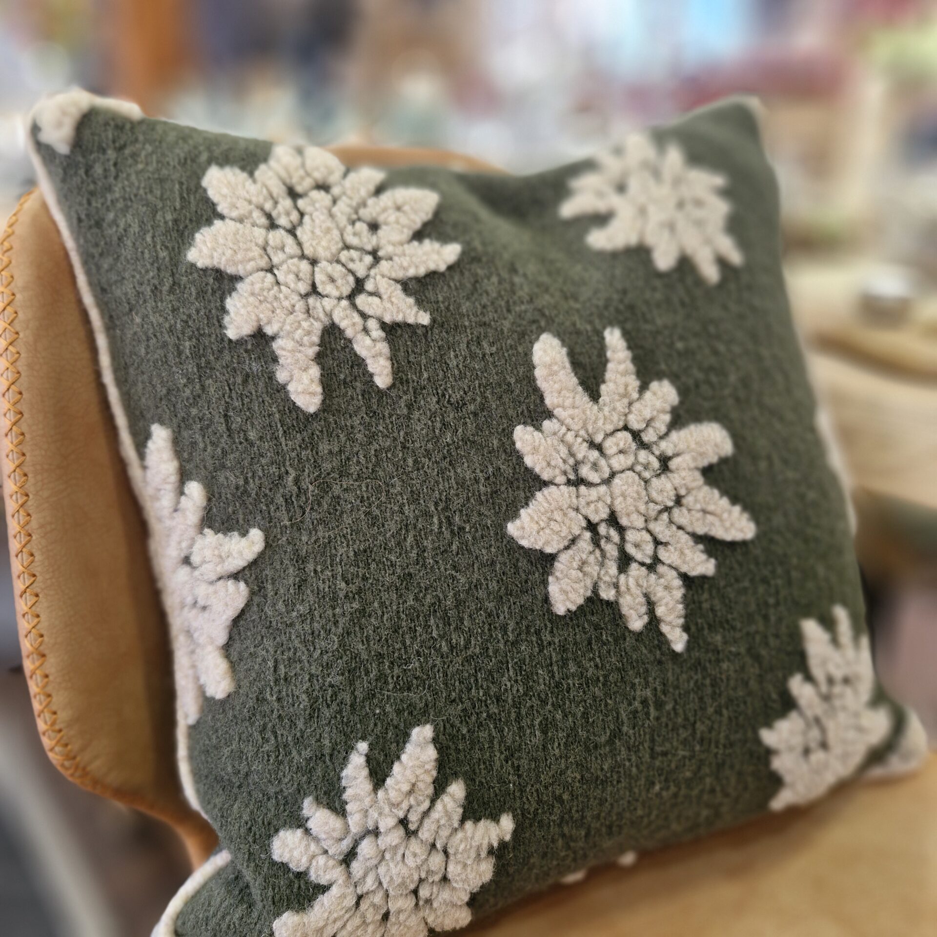 COUSSIN 50X50 FOND VERT MOTIFS EDELWEISS 70% LAINE VIERGE 30% POLYESTER