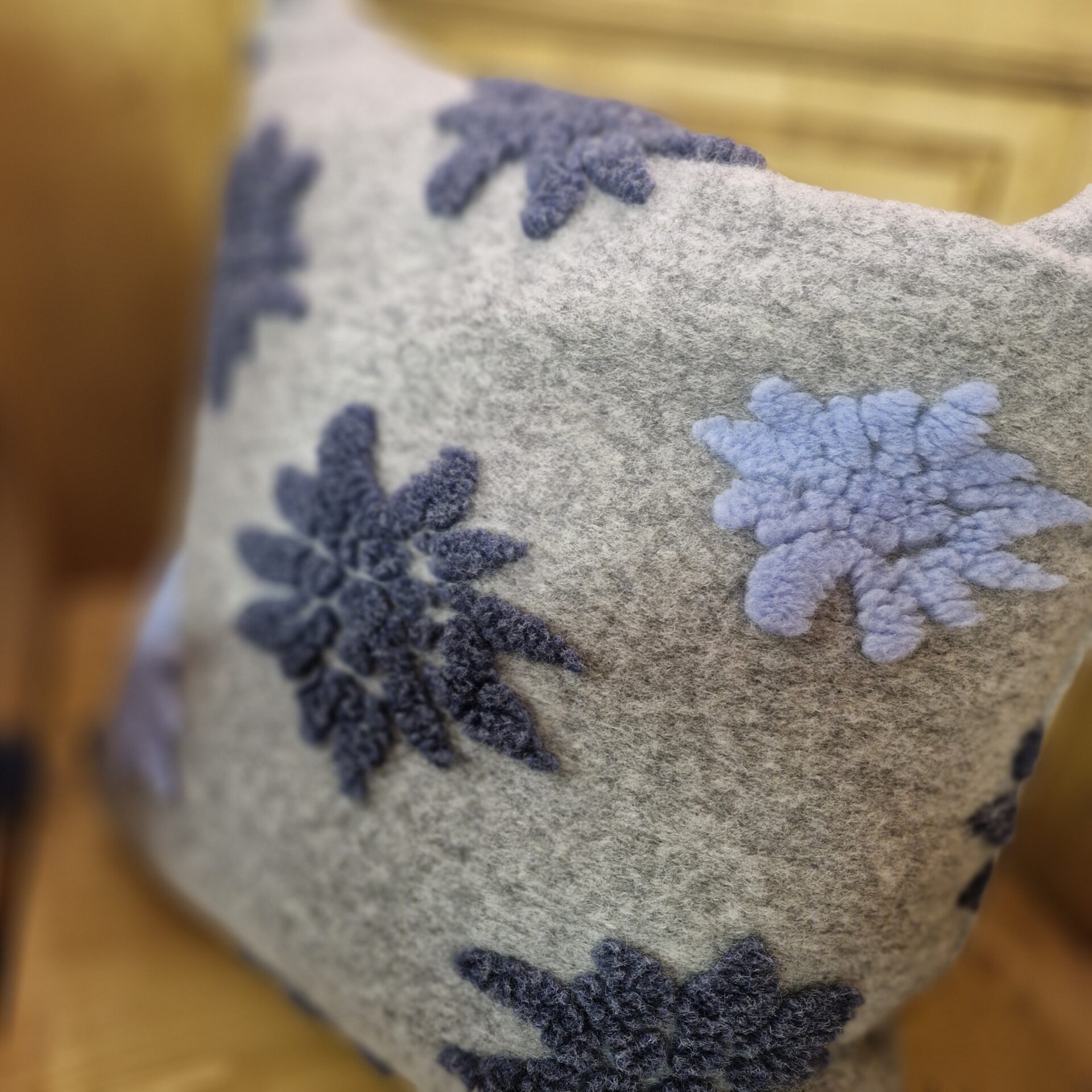 COUSSIN 50X50 FOND GRIS MOTIF EDELWEISS BLEU CIEL/ MARINE RELIEF 70% LAINE VIERGE 30% POLYESTER