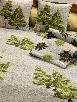 COUSSIN 50X50 FOND GRIS MOTIF SAPINS VERTS RELIEF 70% LAINE VIERGE 30% POLYESTER