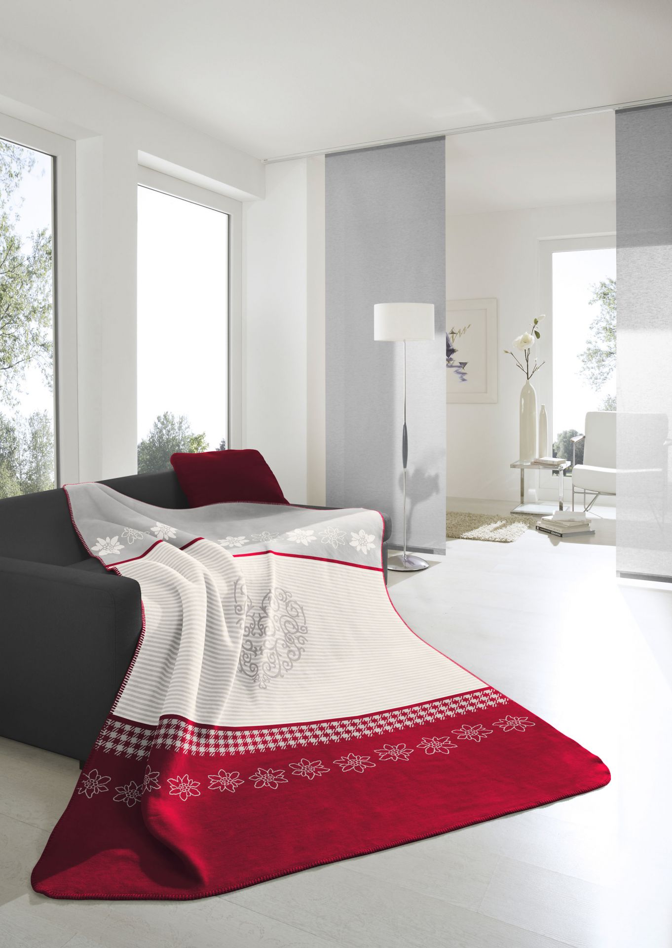 PLAID 150X200 ALPINE ALPINE LOOK COEUR FOND BEIGE ET FRISES EDELWEISS GRIS ET ROUGE