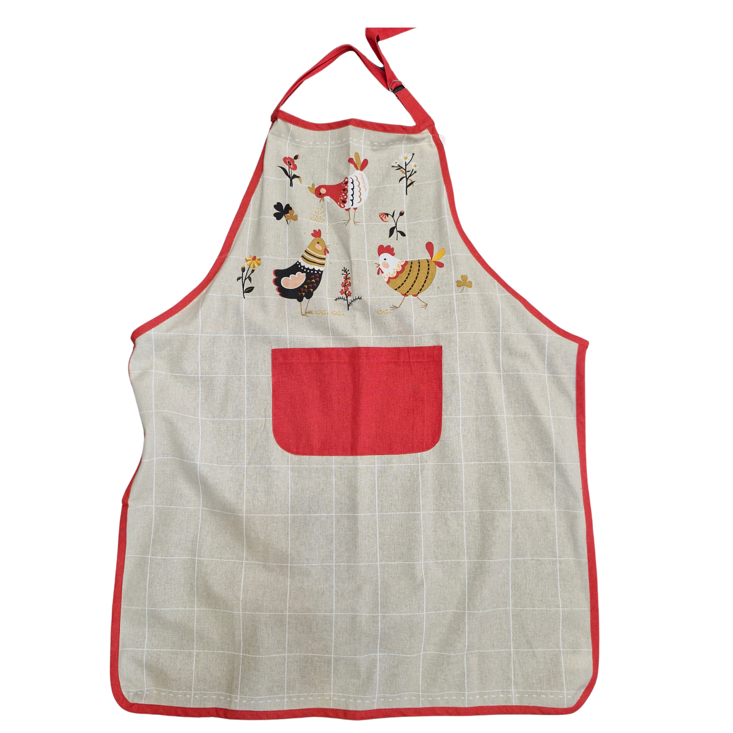 TABLIER COTON SUZANNE POULES FOND BEIGE QUADRILLE CONTOUR ROUGE