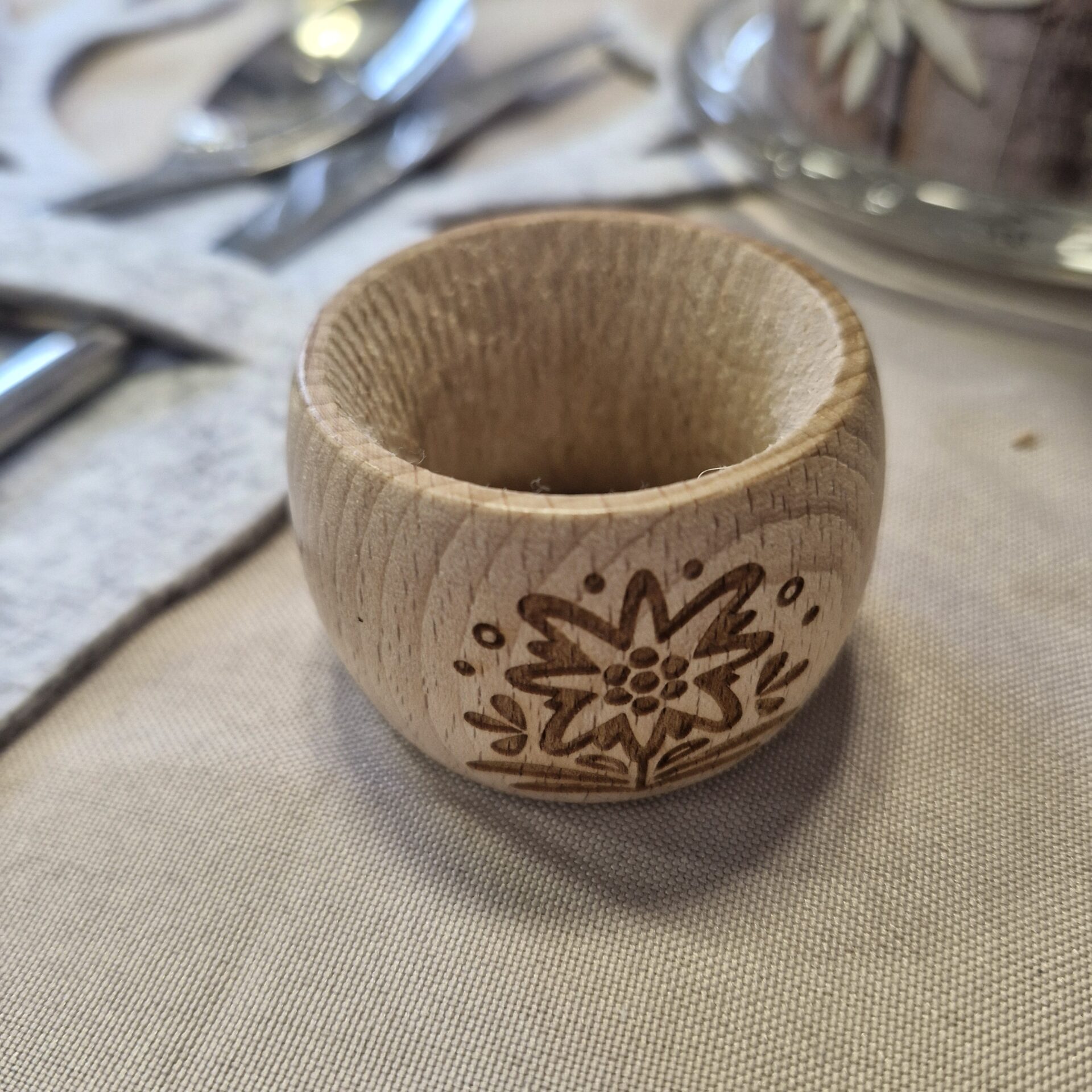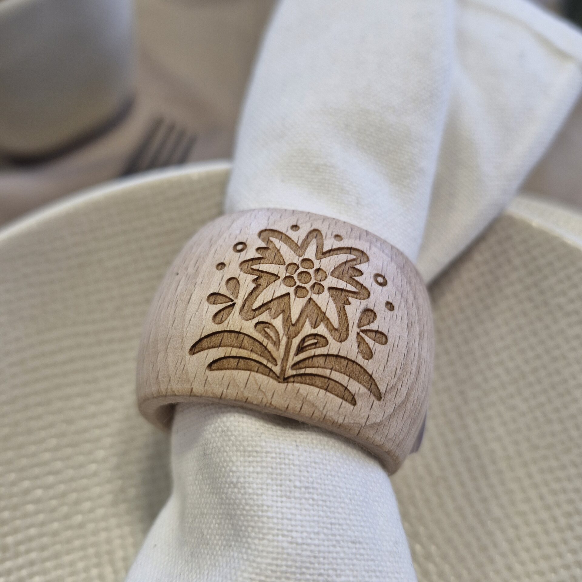 Add a touch of alpine elegance to your table decoration with this wooden napkin ring engraved with an edelweiss motif.