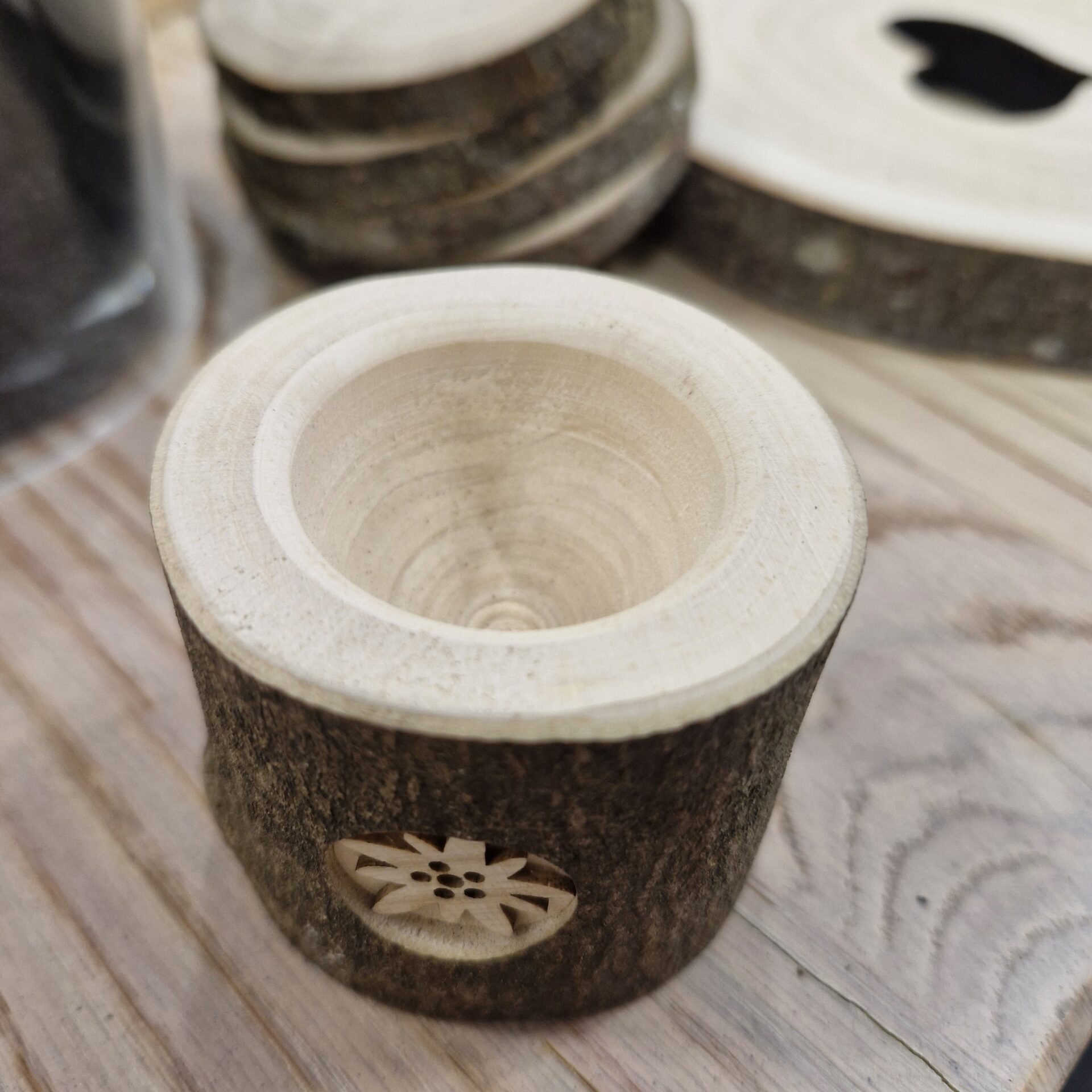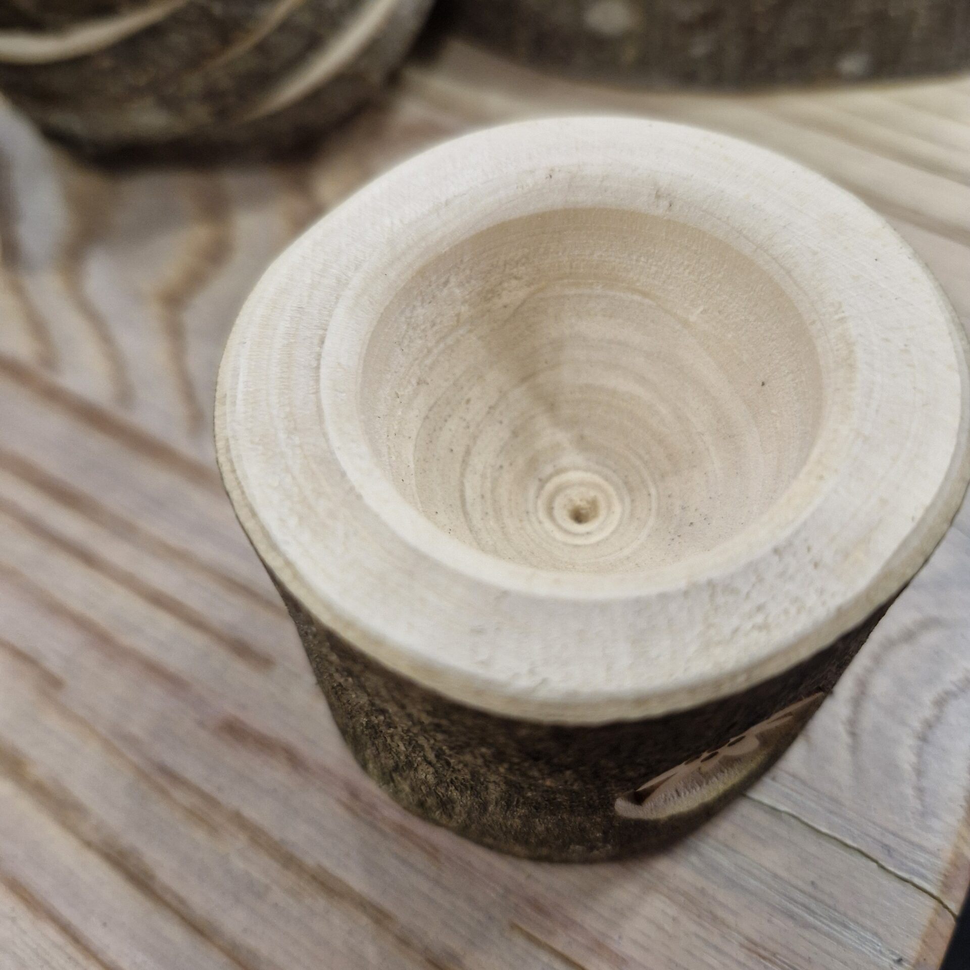 Add a natural and authentic touch to your breakfast table with this wooden egg cup, shaped like a tree trunk. A delicate fir tree pattern is finely inlaid into the wood.