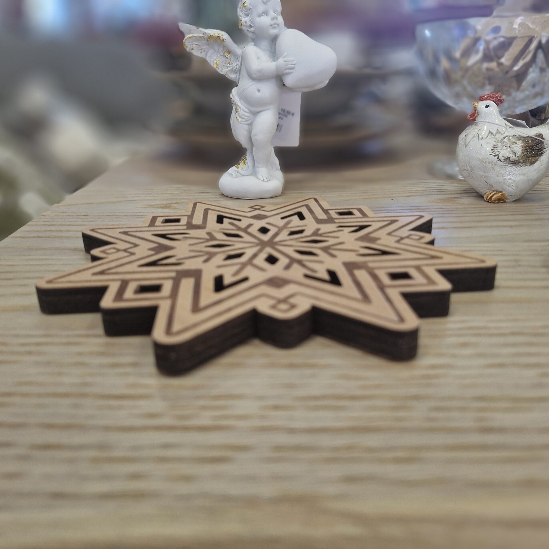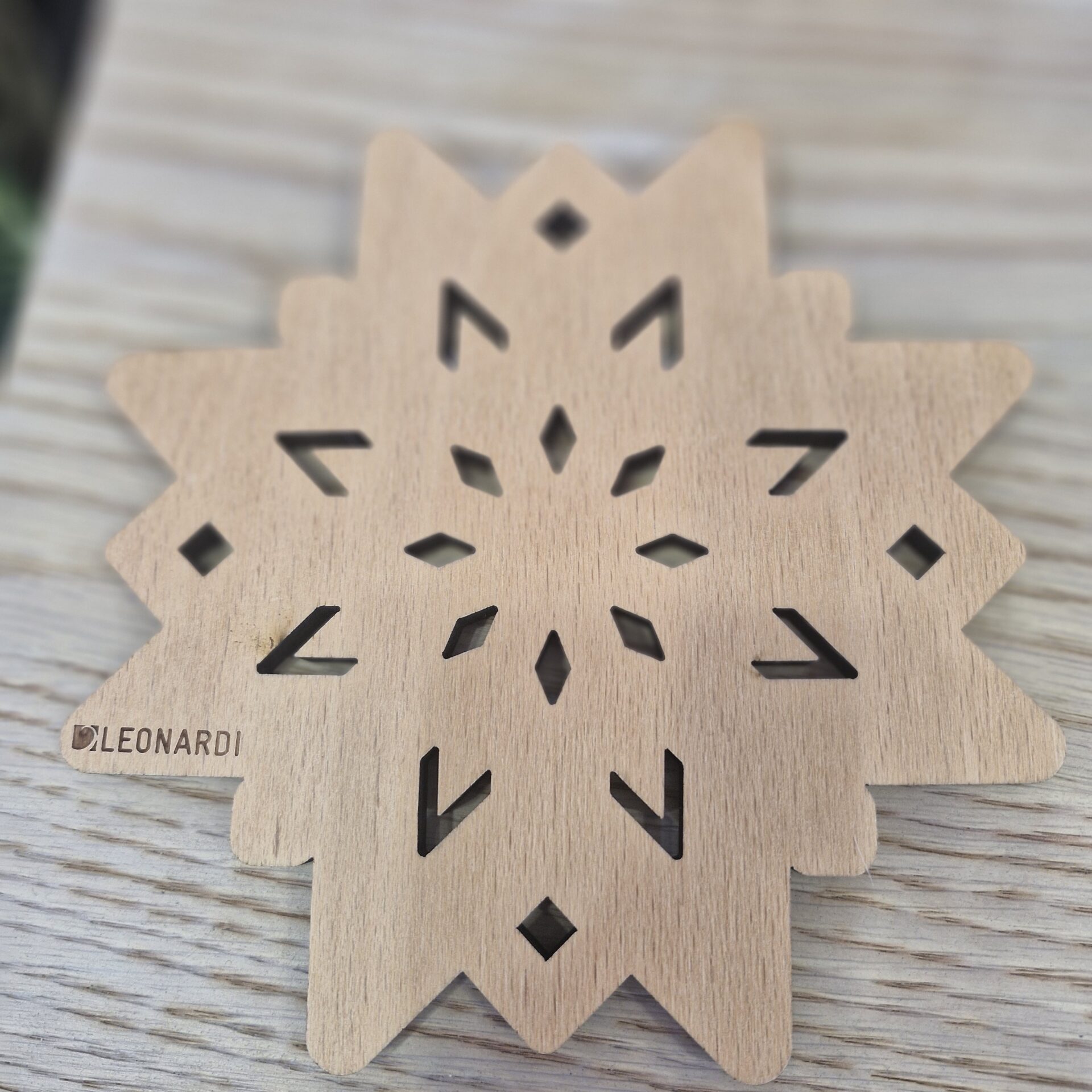 Add a touch of winter charm and elegance to your table with this two-tone wooden trivet, cut into the shape of a snowflake. Its intricate design and the contrast between light and dark wood make it both decorative and practical, perfect for creating a cosy atmosphere in winter and throughout the year.
