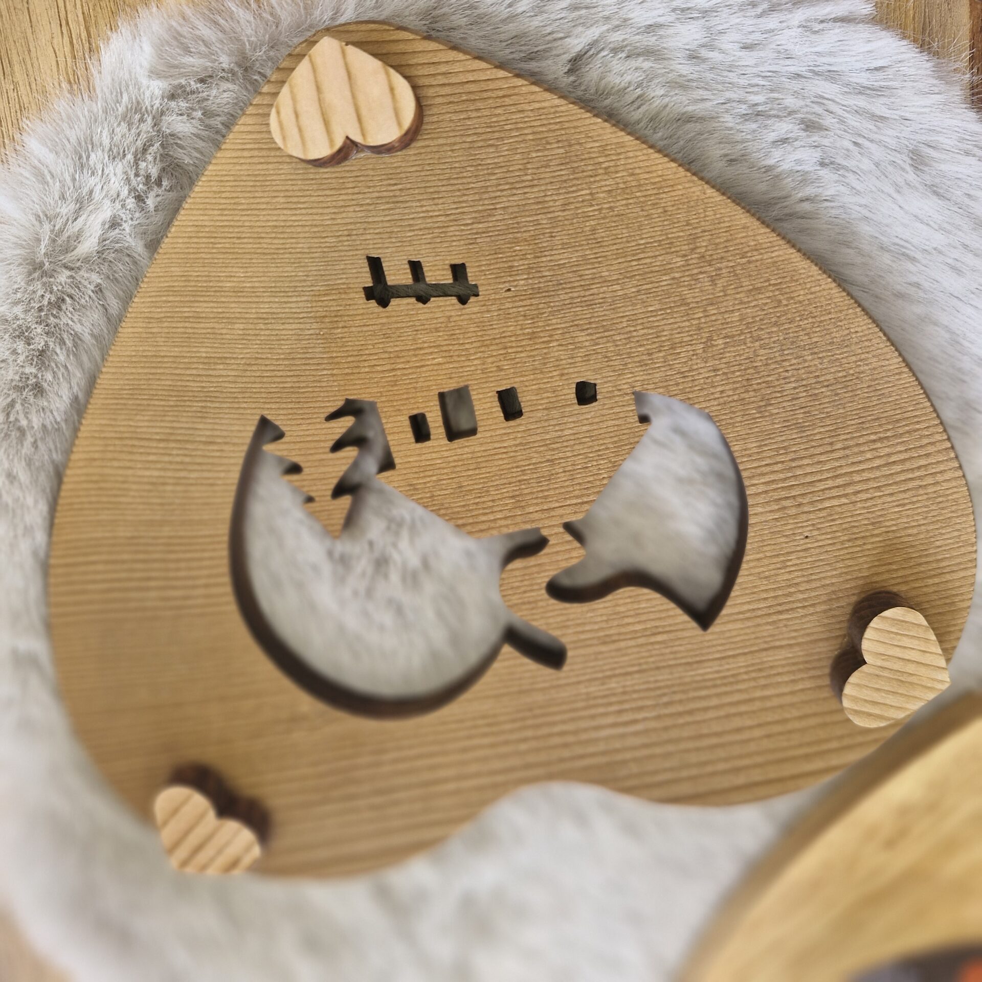 This heart-shaped trivet, made of fir wood, is decorated with a central cut-out depicting a small mountain chalet. Ideal for a warm and authentic table setting, it protects your surfaces while adding a real chalet-style decorative touch.