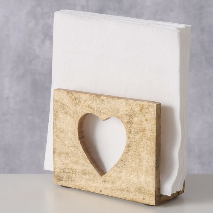 Porte serviettes vertical en bois de manguier Découpe en forme de coeur Dimensions : 10x13x5,5cm Convient pour 20 serviettes papier