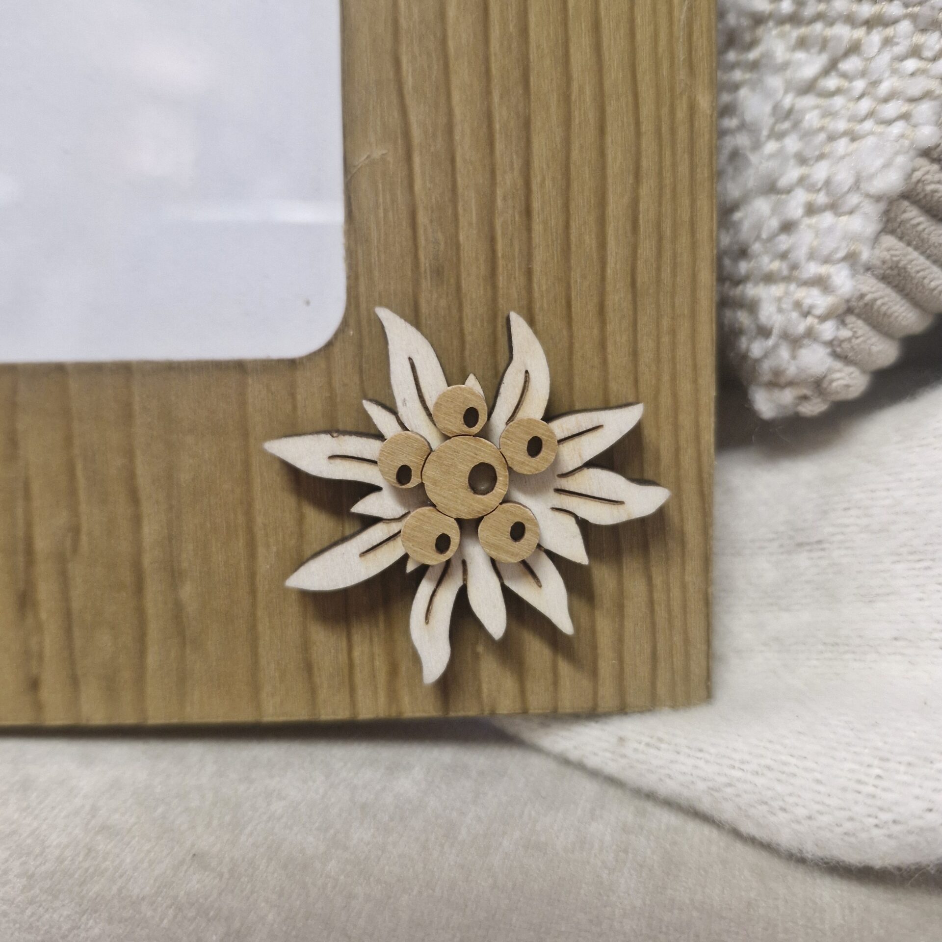 Ce cadre photo en bois est orné de deux edelweiss en relief, emblèmes emblématiques des Alpes. Sobre et élégant, il met en valeur vos plus beaux souvenirs tout en apportant une touche montagnarde et florale à votre décoration.