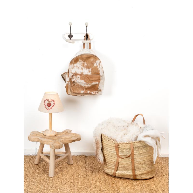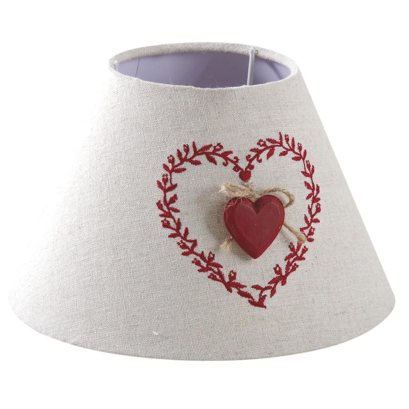 A natural linen and cotton lampshade, decorated with a red wooden heart and red embroidery. A warm and charming piece.