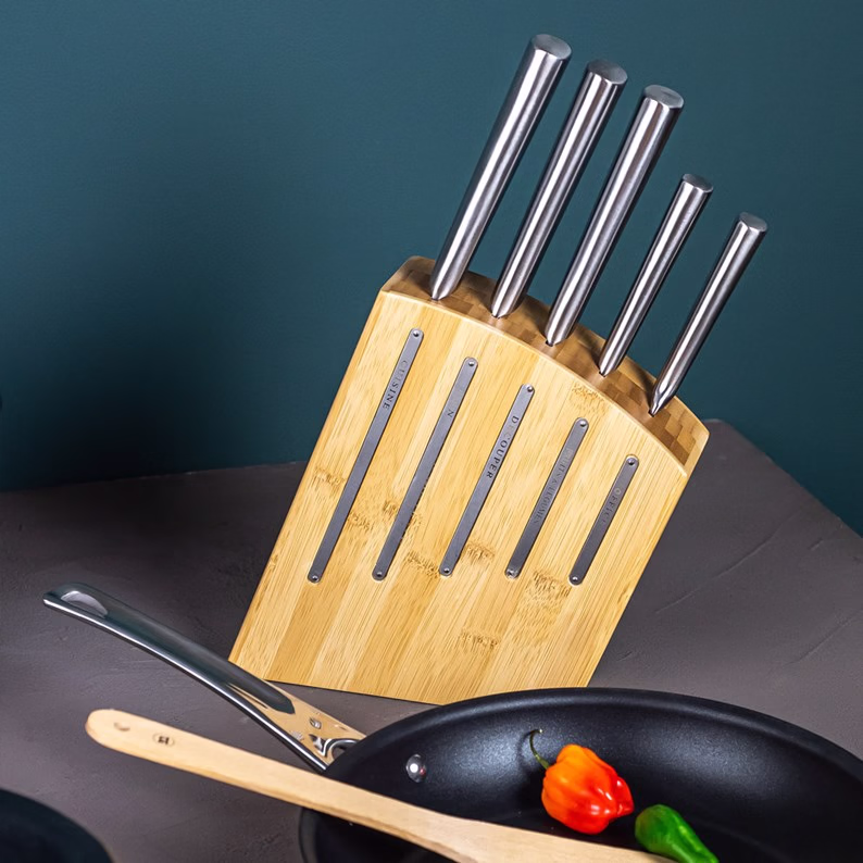 Bloc de 5 couteaux en Inox Socle bambou teinte claire Marque Jean Dubost Dim : 23x7x23cm