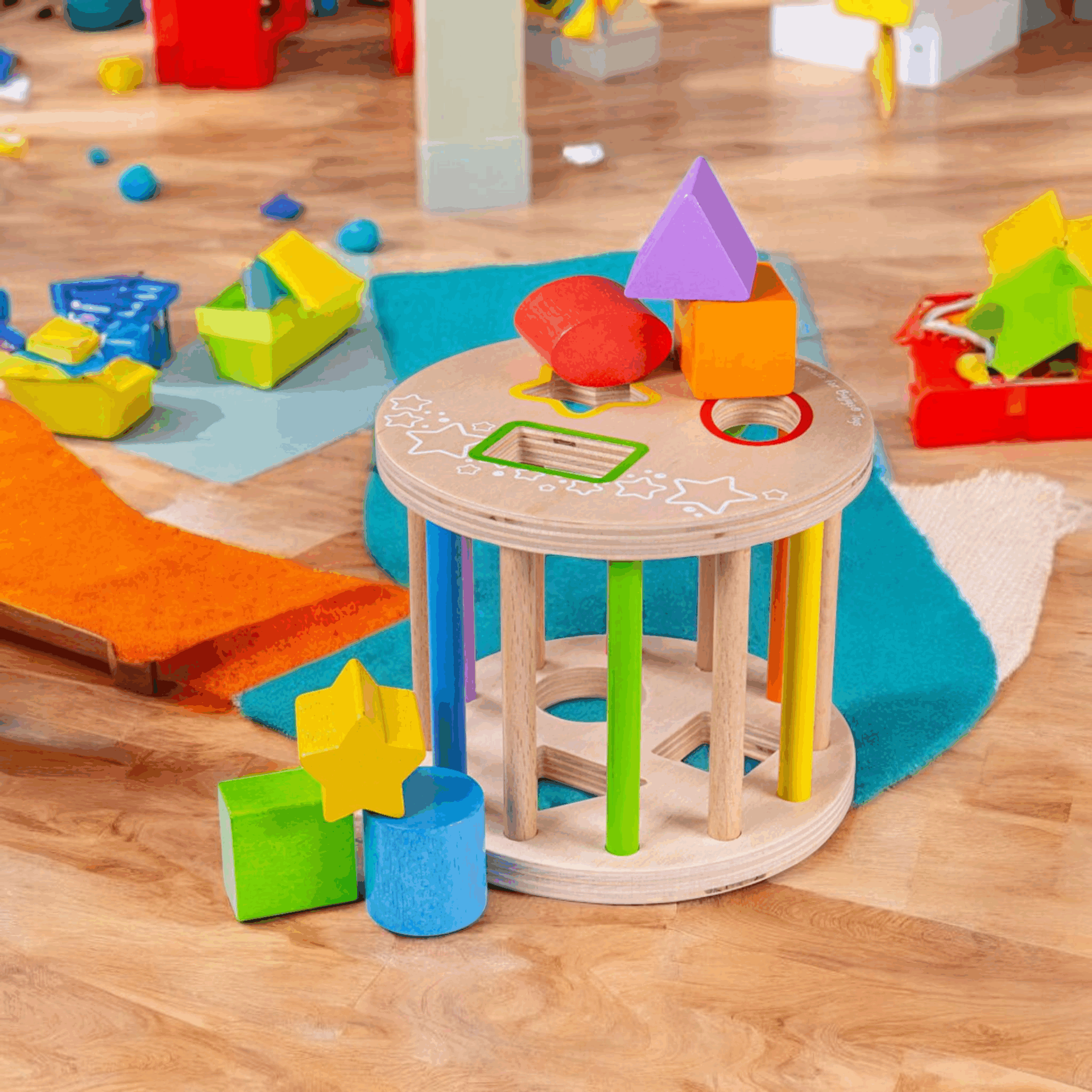 Insert the coloured wooden shapes into the slot at the top of this shape sorter on wheels. Once filled, roll this unique wooden shape sorter around to hear all the shapes rattling inside!