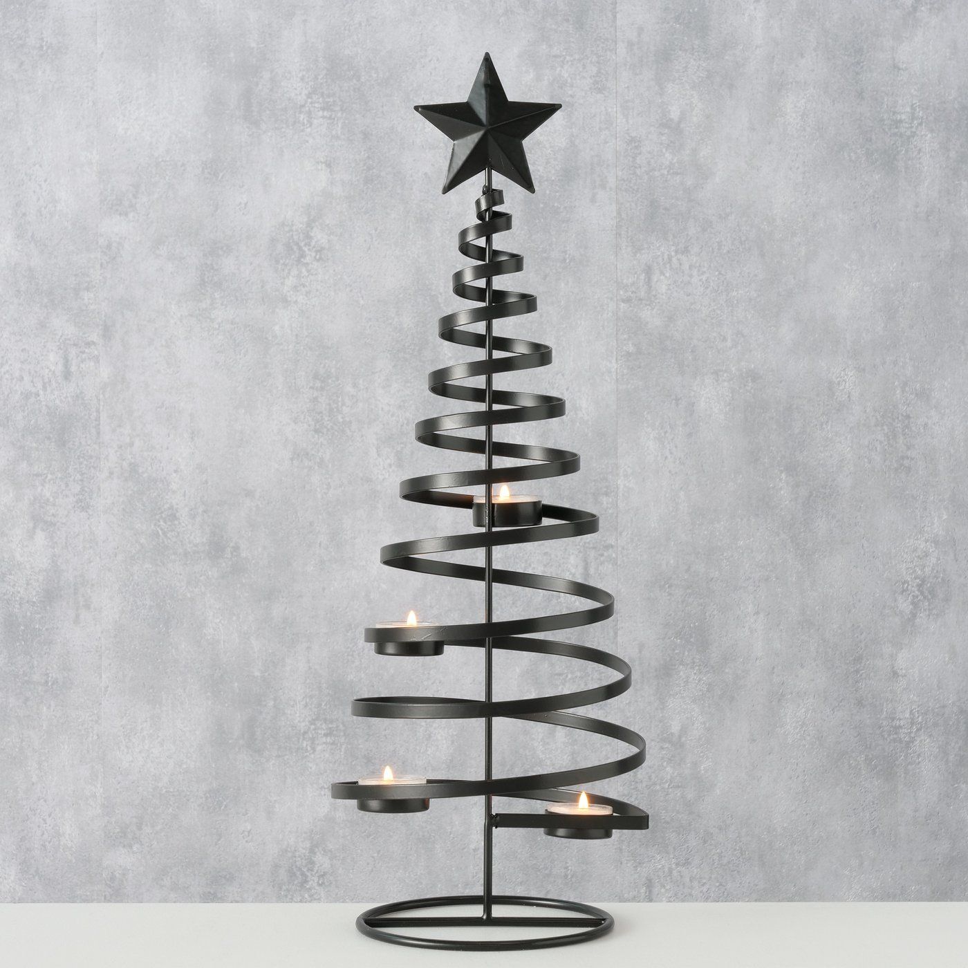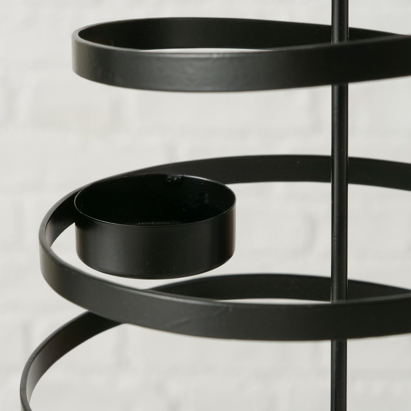 Bougeoir 4 feux en métal noir Forme sapin spirale Dimensions : 15x15x51cm Bougies non fournies. Possibilité d’achat sur notre site