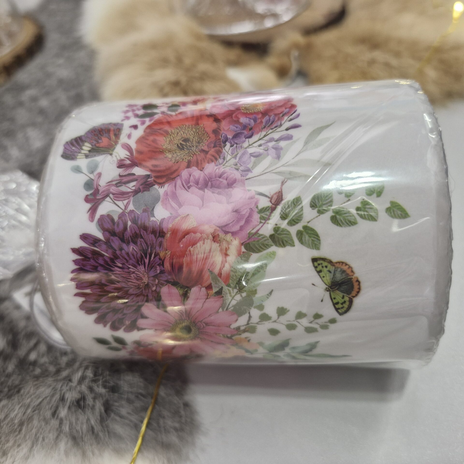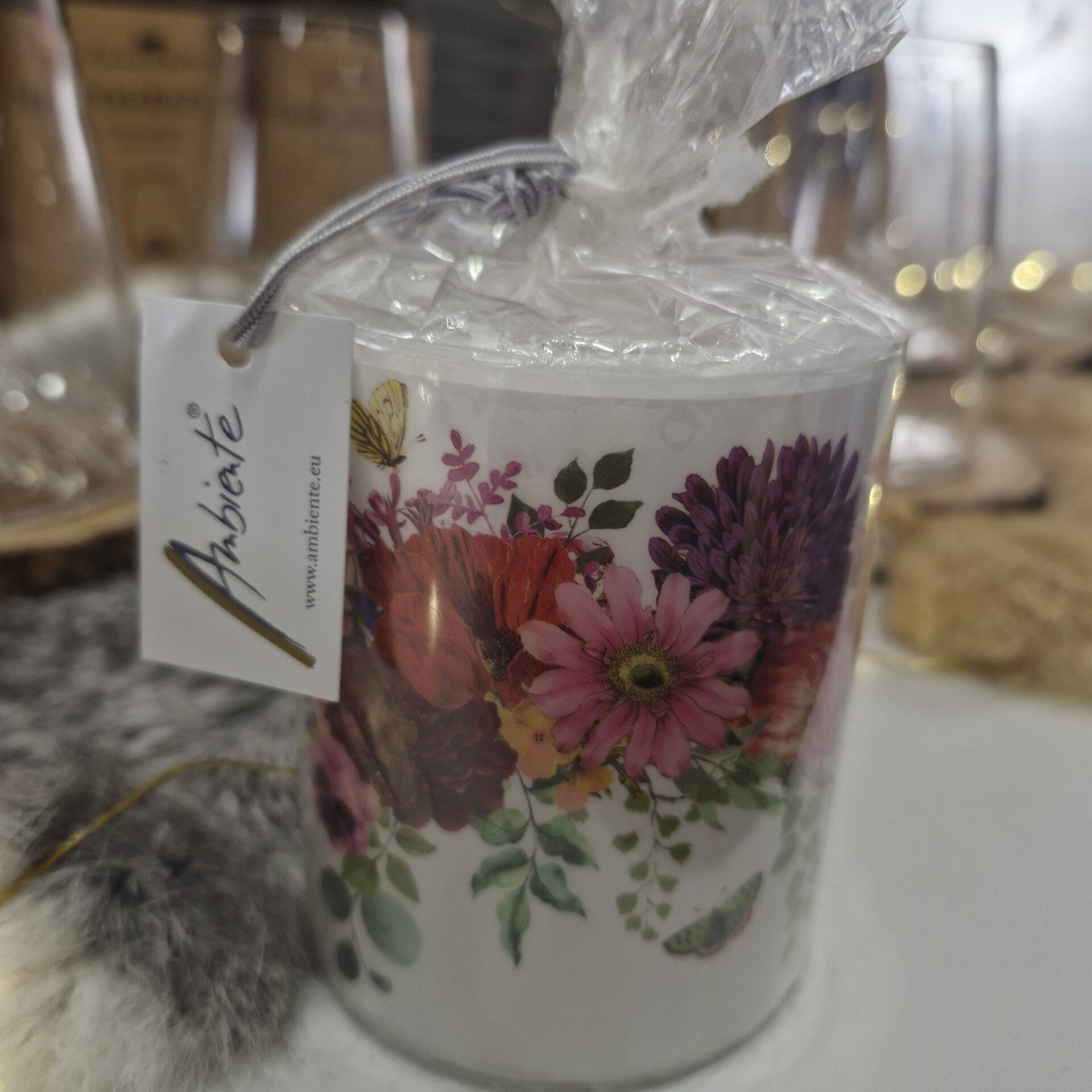 Elegant and generously flowered, this decorative candle is adorned with a beautiful garland of pink and red flowers.