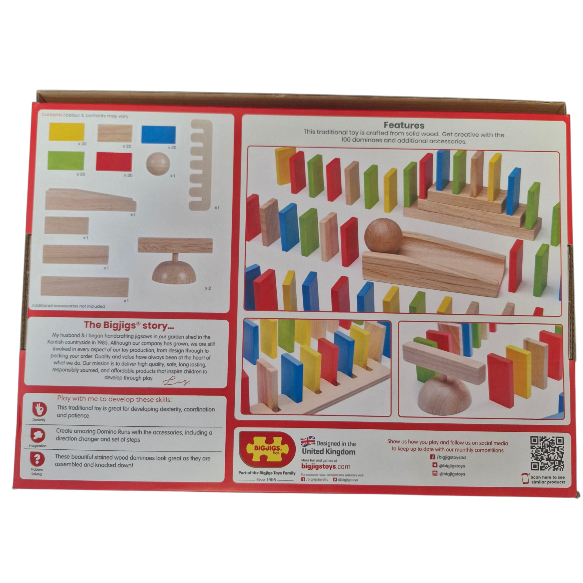 Domino Run is a large set of wooden dominoes that will keep children – and even adults – entertained for hours. Children can arrange the dominoes in different sequences, knock them down and start again, over and over! This 110-piece domino set comes with a ball, a ramp, two direction changers and a staircase that can be added to any sequence for even more exciting play!