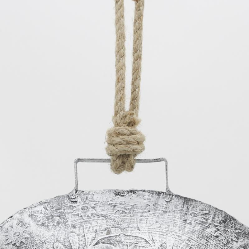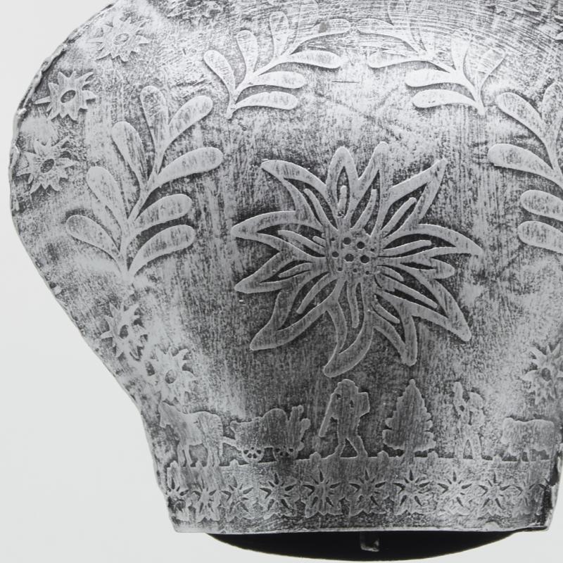 This silver-toned antique-finish metal bell is delicately adorned with an edelweiss motif, the iconic flower of the Alpine peaks. Hang it up to add an authentic and refined touch; it evokes the spirit of high-altitude chalets and mountain traditions