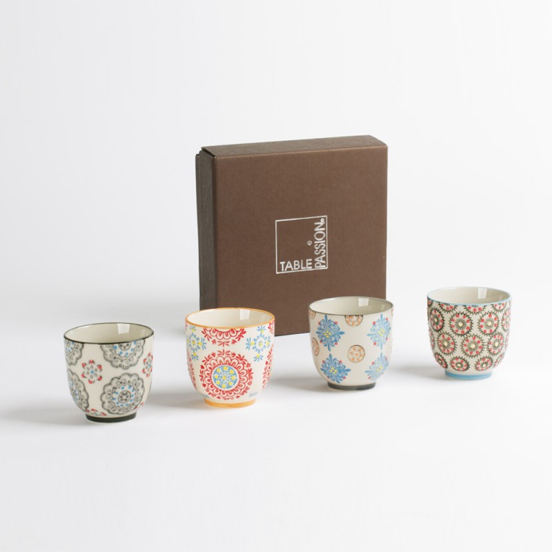 coffret de 4 gobelets en grès Coloris et motifs assortis Diam : 7cm, hauteur 7cm Convient au lave vaisselle et au micro ondes Contenance 150ml