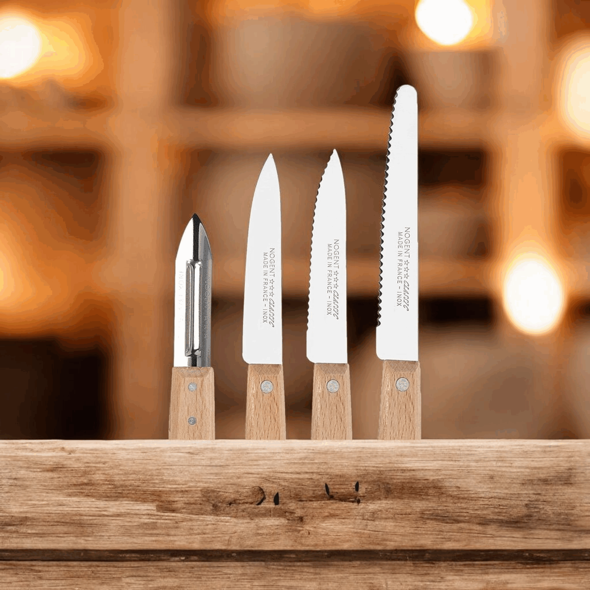 Set de 4 couteaux de cuisine dont : 1 économe 16cm 1 couteau d’office 18cm 2 couteaux à dents (19cm et 21cm) Manche en bois en hêtre et lame Inox Marque Nogent, fabrication française Convient au lave vaisselle. Indémanchable