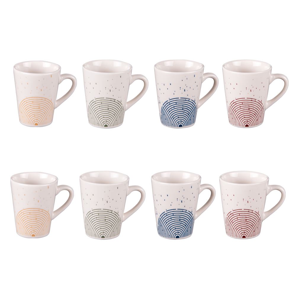 Coffret de 8 tasses à expresso en porcelaine blanche Motifs lignes et coloris assortis Contenance : 10cl Hauteur 6,5cm Compatible au micro-ondes et au lave-vaisselle pour un entretien sans contrainte.