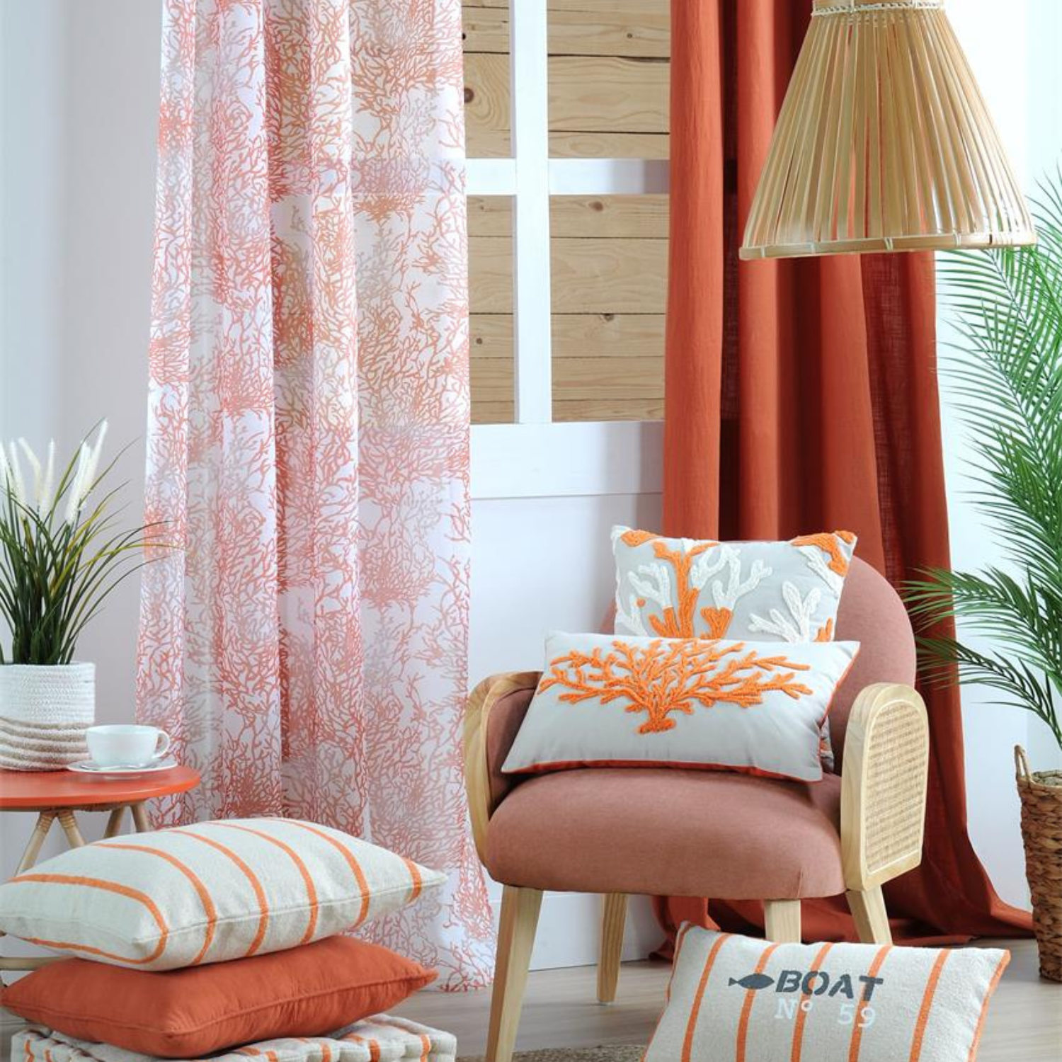 A rectangular cushion measuring 30×50 cm in elegant shades of beige and coral, perfect for adding a warm, seaside touch to your interior décor. Its design is enhanced by the ‘Boat No. 59’ inscription, evoking a holiday spirit and a sense of escape.
