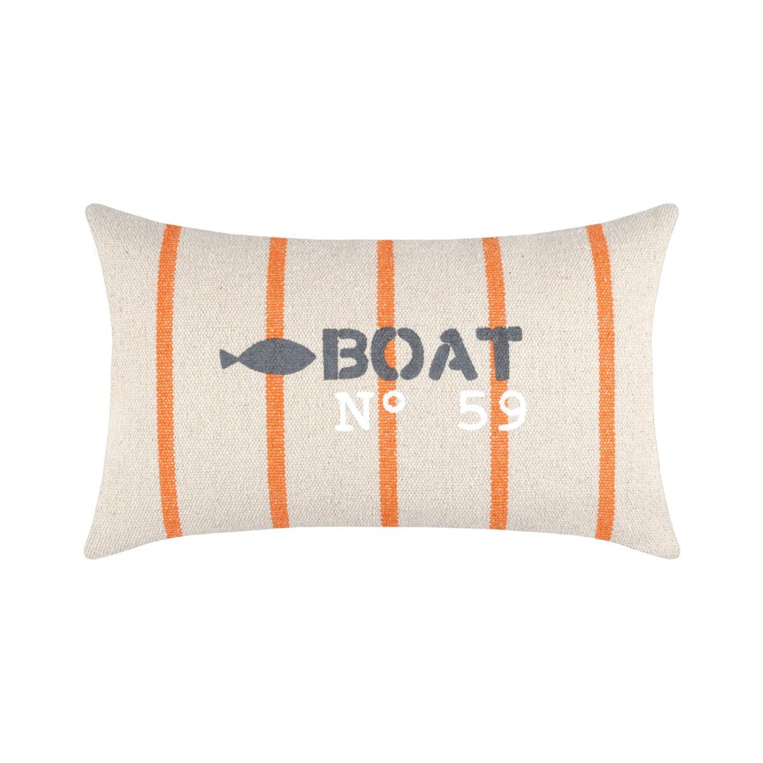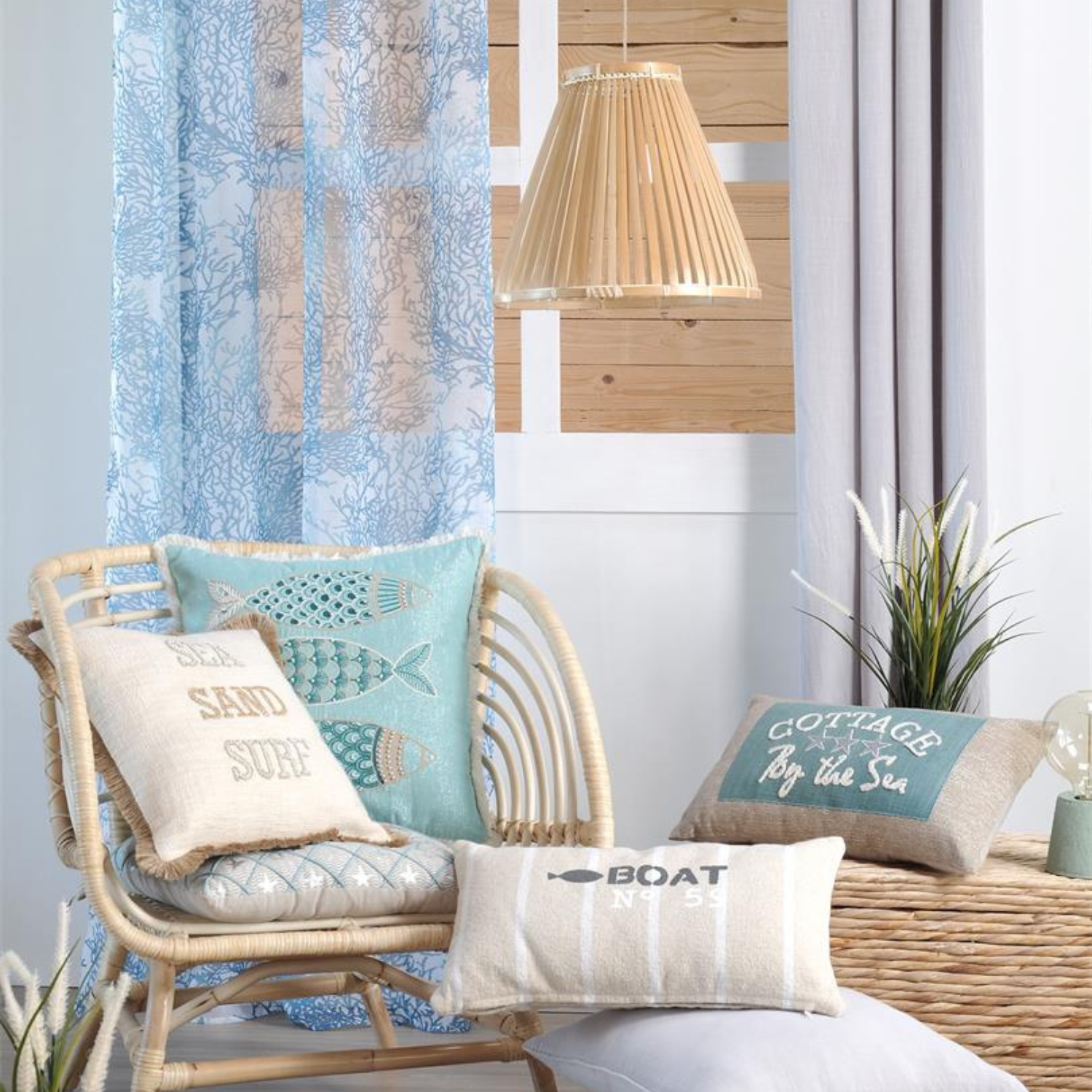A beach/lake-style cushion in beige with white stripes, featuring a navy blue fish and nautical lettering. Perfect for creating an elegant yet relaxed seaside atmosphere in your home.