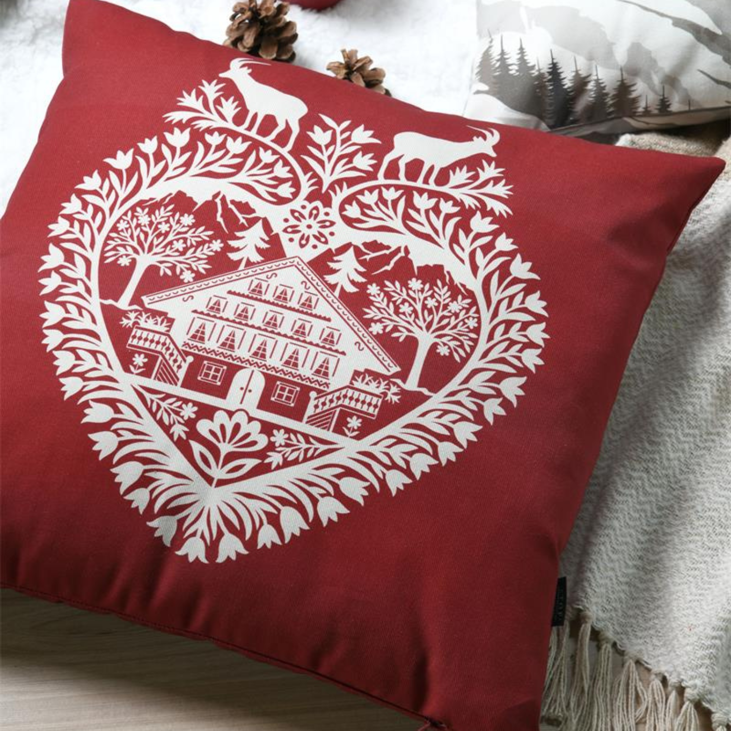 Red cushion, 50×50 cm, featuring a Poya-style pattern within a stylised heart, depicting ibex. With a mountain feel and traditional charm, it’s perfect for adding an alpine touch to your living room or bedroom.