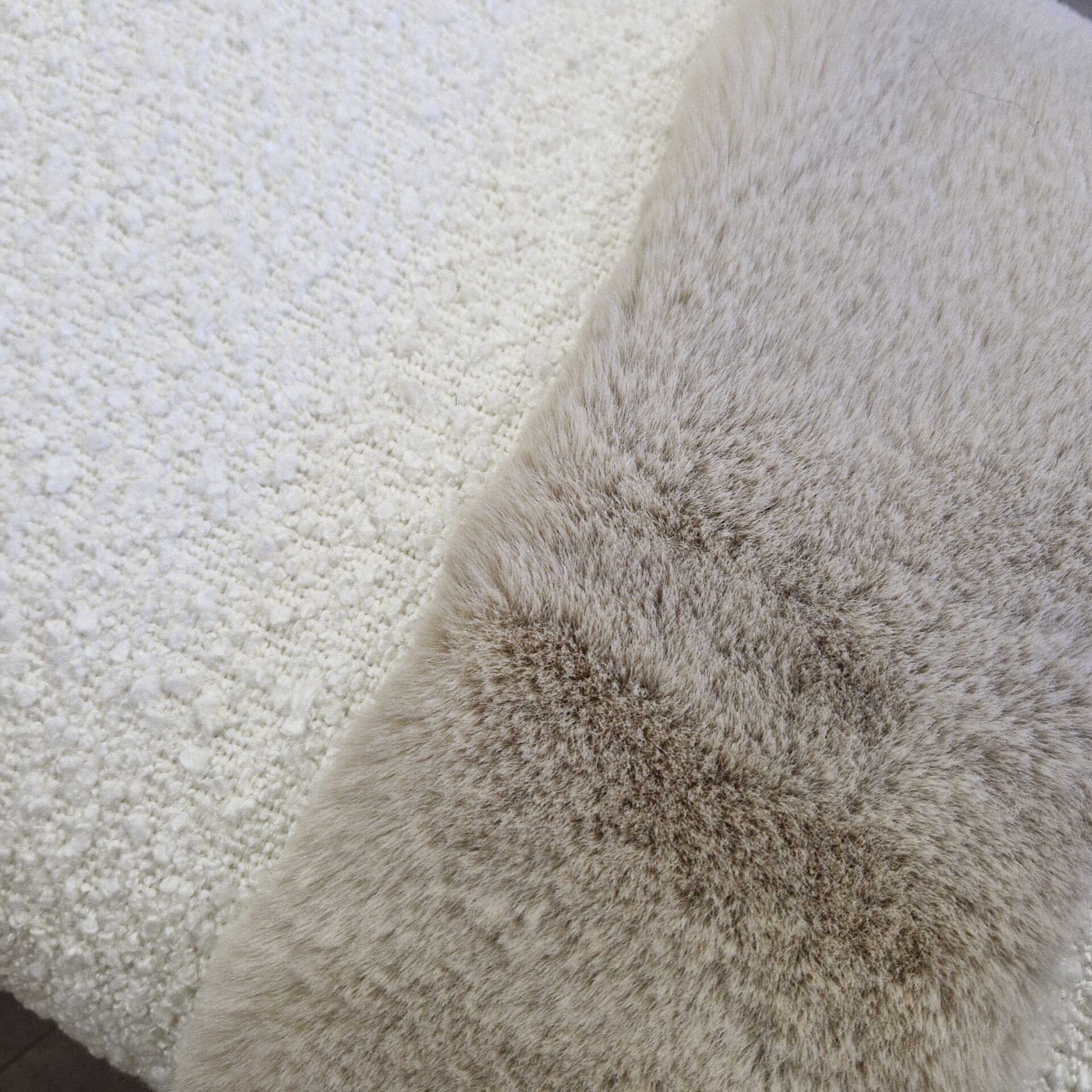 Coussin tissu 60x40cm 95% polyester/ 5% acrylique Coloris ecru, effet bouclette Arrière cotelé Bande de fausse fourrure beige Déhoussable – fermeture éclair Nettoyage à sec uniquement Ne pas laver à l’eau Repassage medium Fabriqué en Suisse