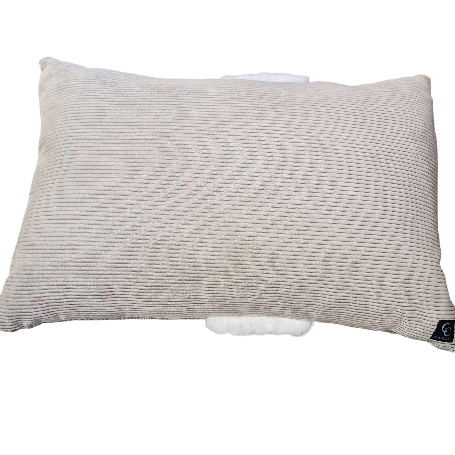 Coussin tissu 60x40cm 95% polyester/ 5% acrylique Coloris taupe, effet bouclette Arrière côtelé Bande de fausse fourrure écrue Déhoussable – fermeture éclair Nettoyage à sec uniquement Ne pas laver à l’eau Repassage medium Fabriqué en Suisse