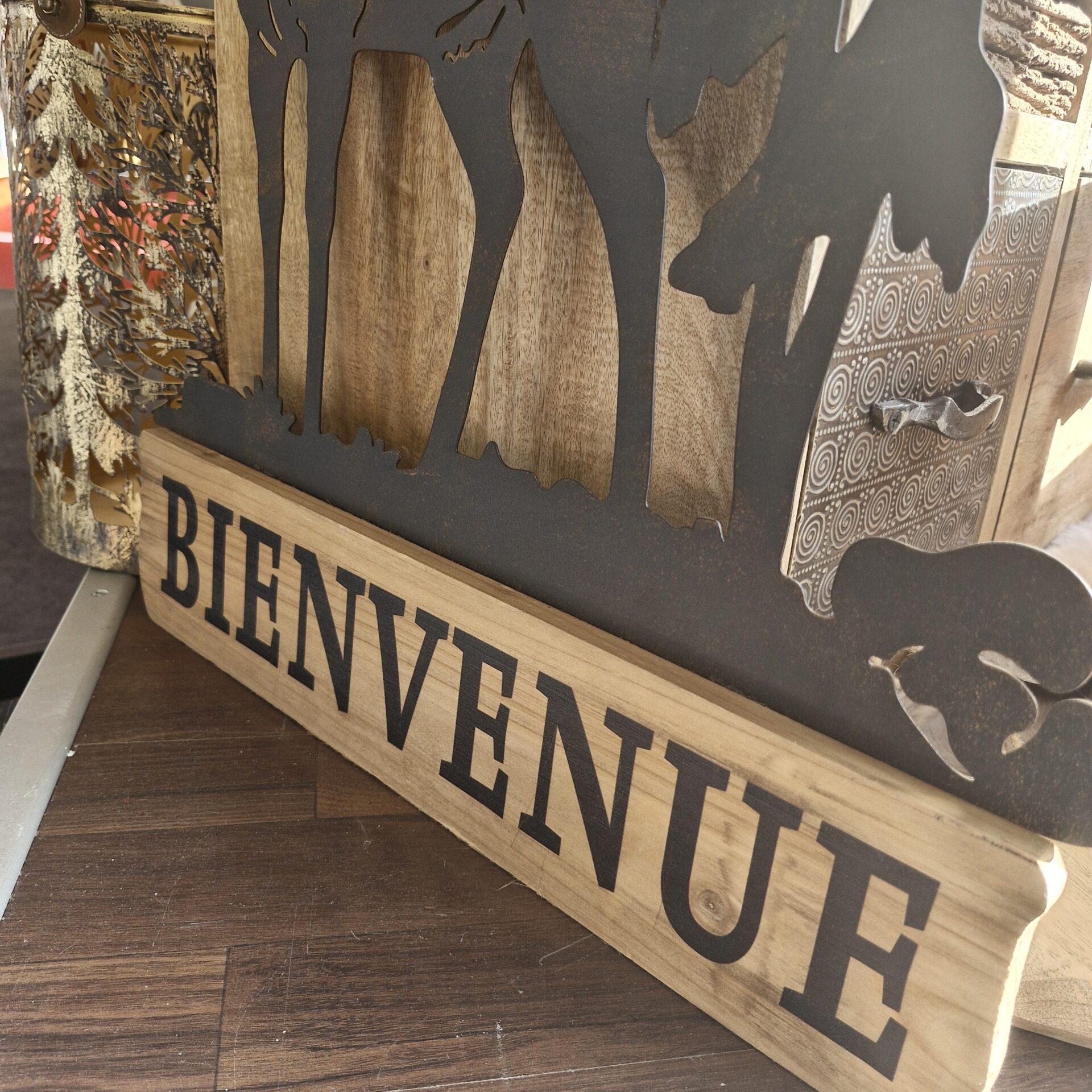 With its distressed metal finish and Bienvenue inscription painted on the wood, this wall decoration evokes the charm of yesteryear.