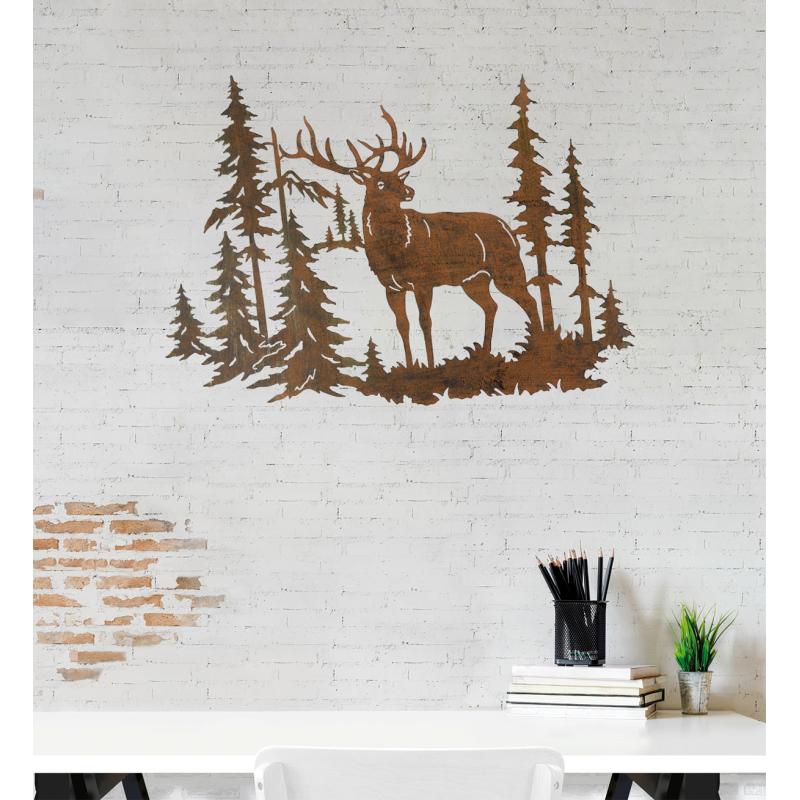 Décoration murale en métal vieilli à motif cerf et fôret de sapins