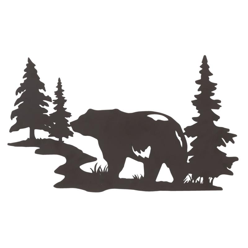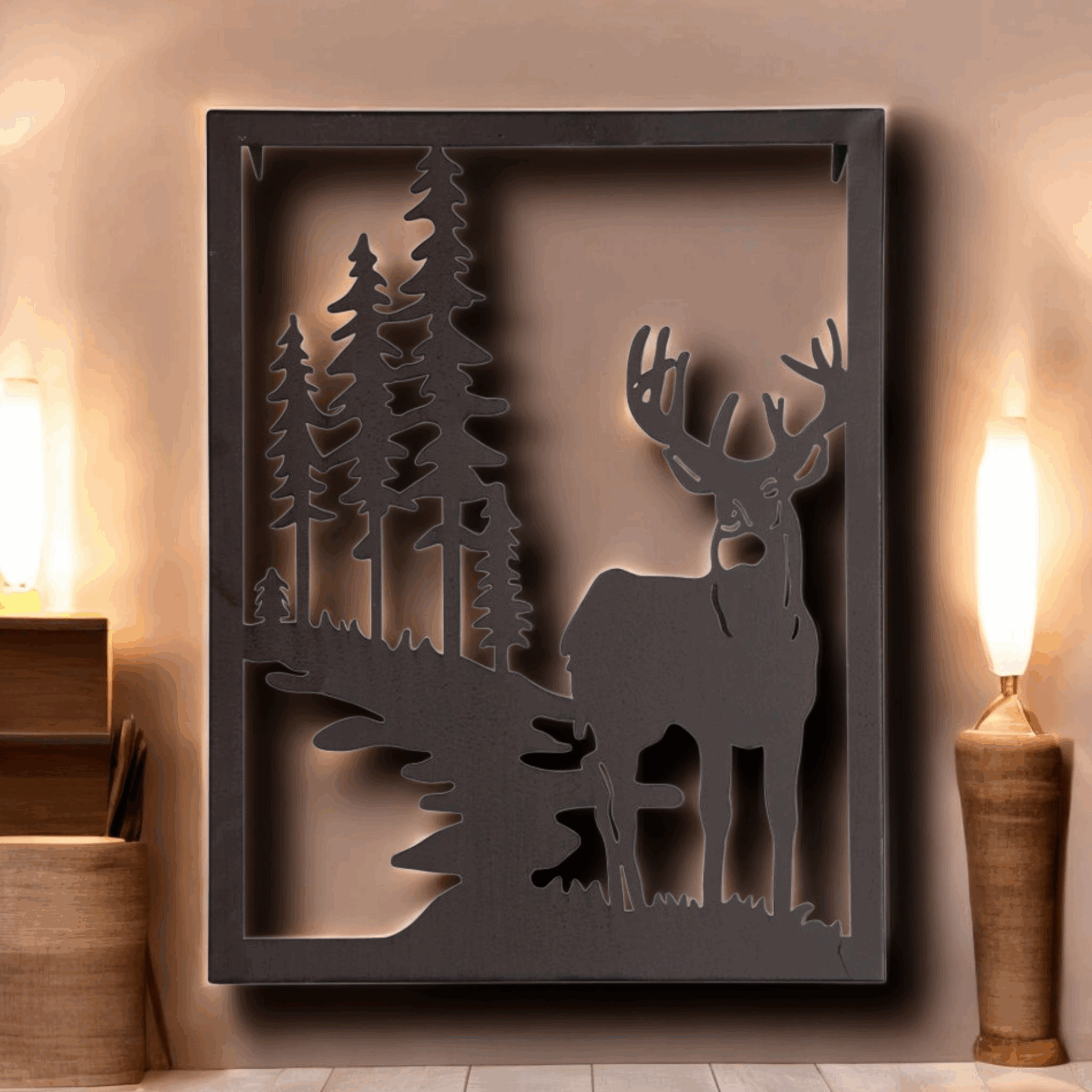 Evoking the tranquillity of deep forests, this black metal wall frame features a majestic stag standing next to a fir tree, all finely cut from metal with patinated brown highlights.