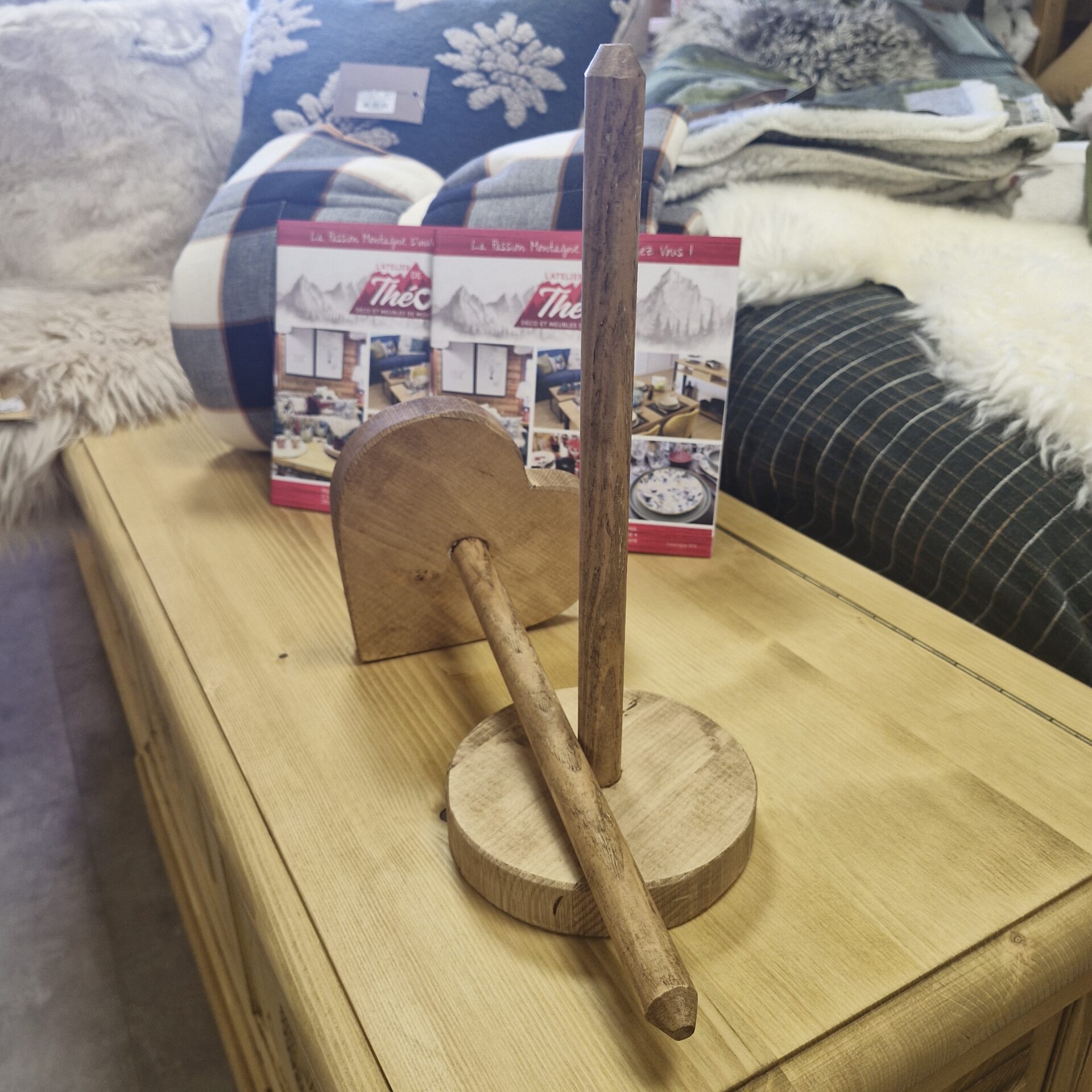 Dérouleur de sopalin en bois d’épicéa ciré, avec support en forme ronde et tige longue.