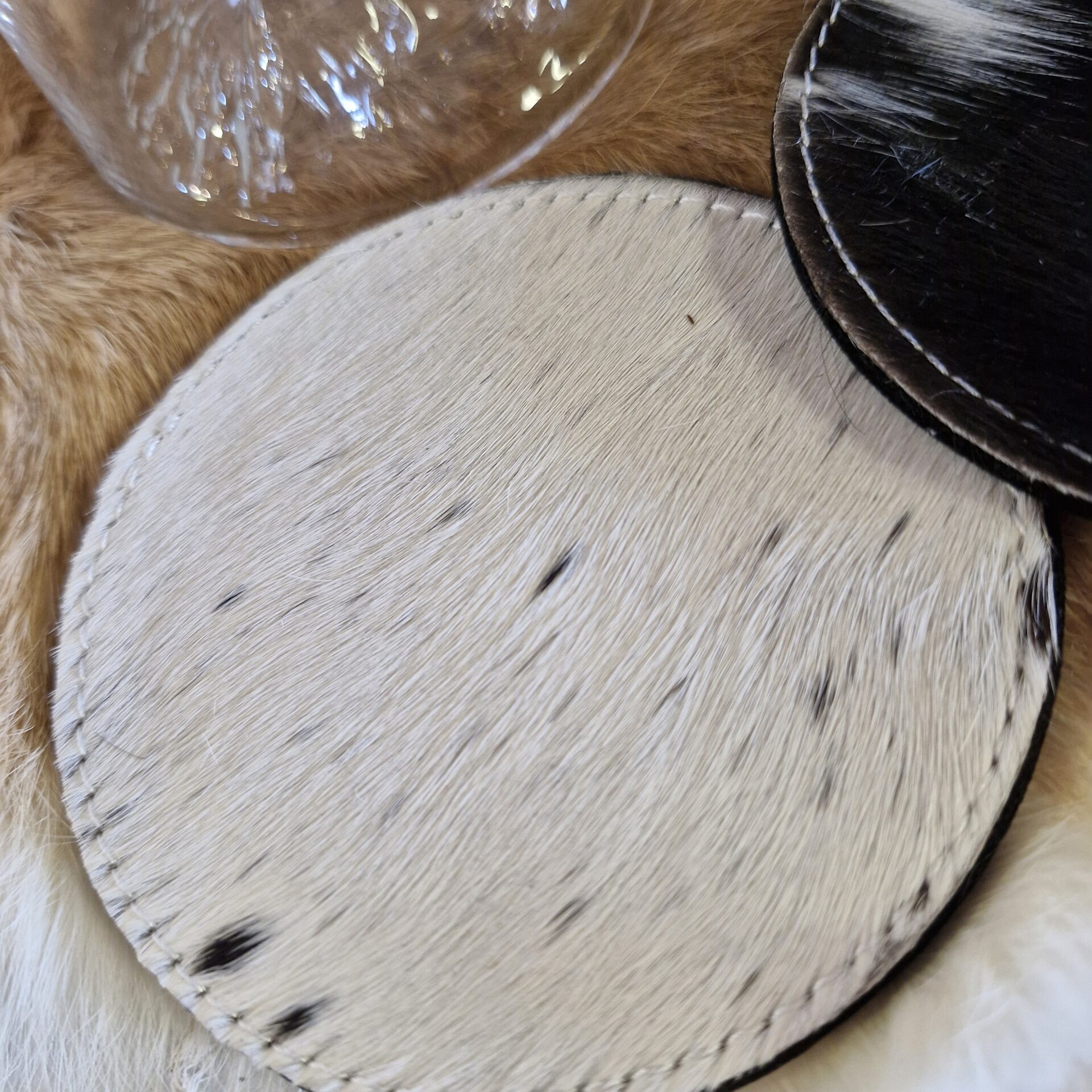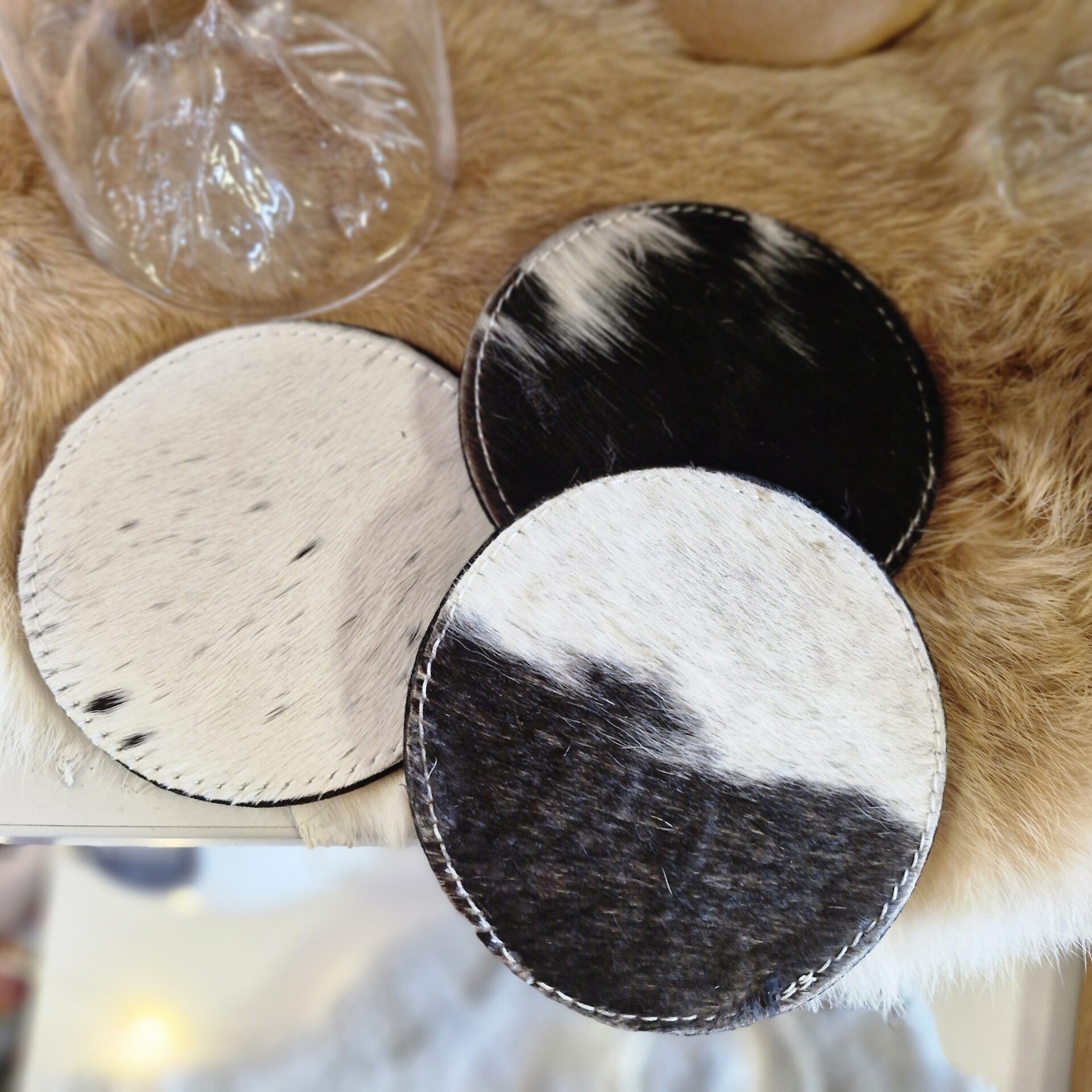Add a touch of authenticity and rustic elegance to your table with these beautiful round coasters made from genuine cowhide.