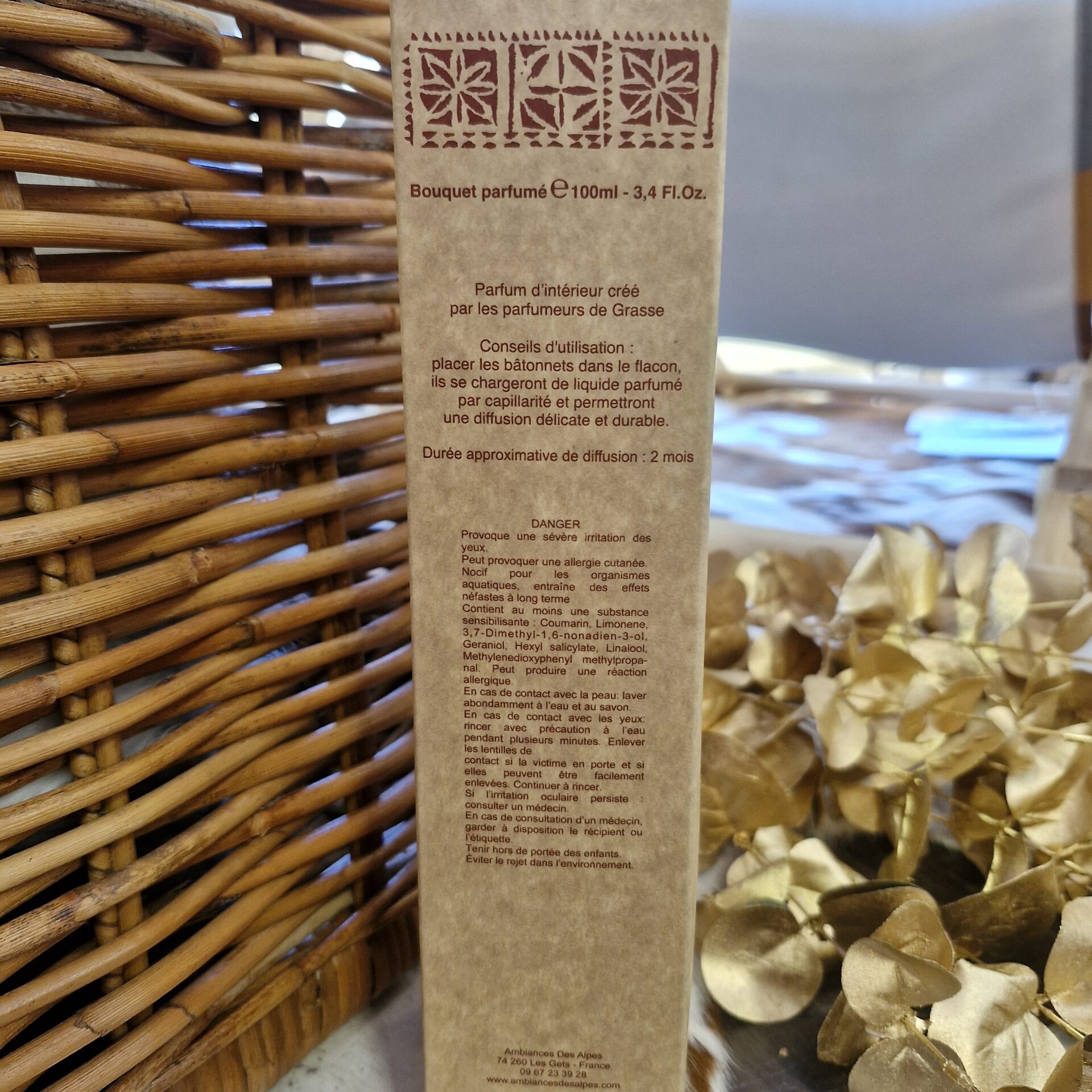 Bouquet parfumé flacon en verre 100ml Durée de diffusion 2 mois Parfum de Grasse Fabrication artisanale française Alcool dénaturé – eau – parfum Peut contenir au moins une substance sensibilisante Liquide très inflammable – Respecter les précautions d’emploi.