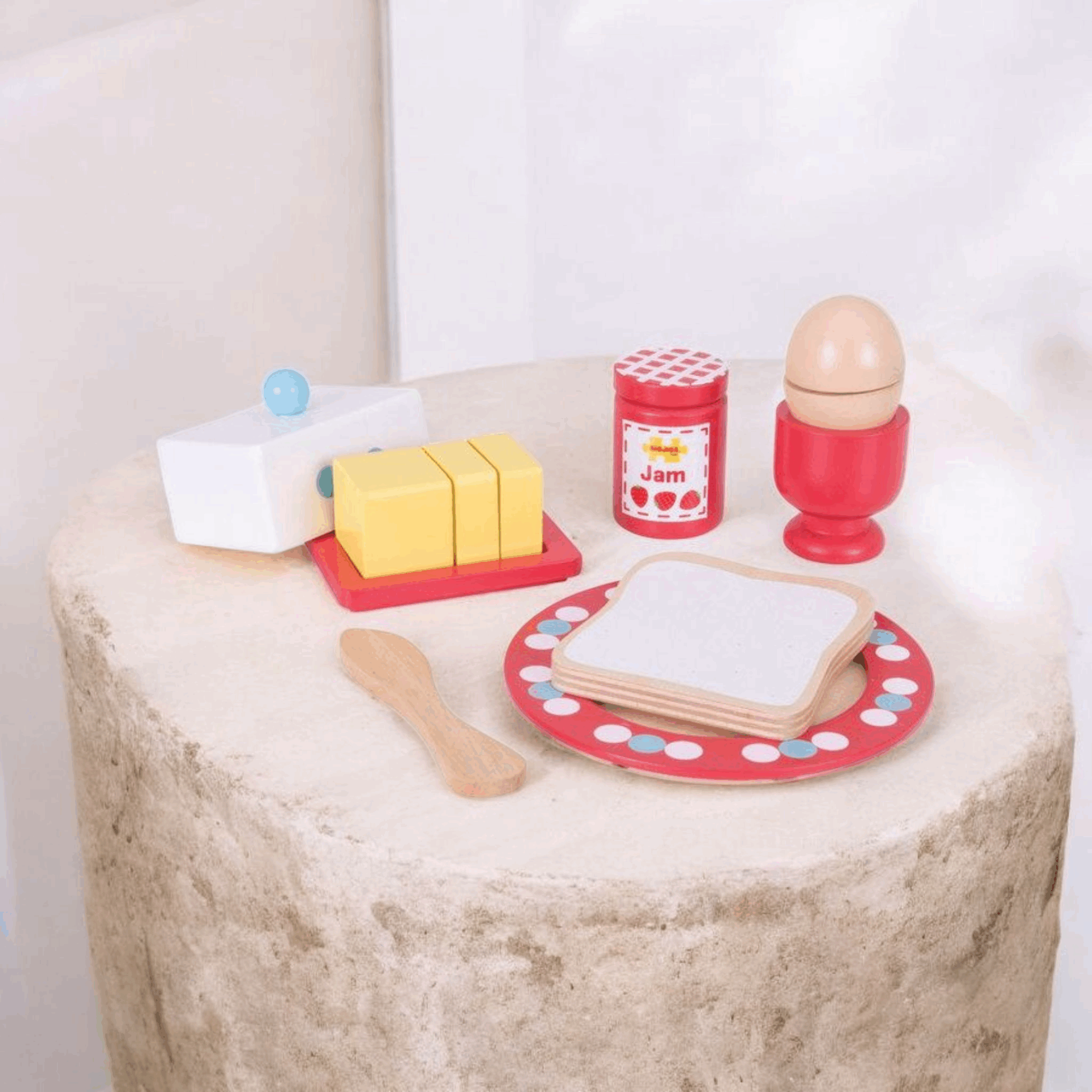 It includes everything you need for a delicious breakfast: a slice of bread, a knife, a jar of jam, a plate, a butter knife, a butter dish, an egg cup and a boiled egg. Children can recreate their favourite morning moments while developing their fine motor skills and language.