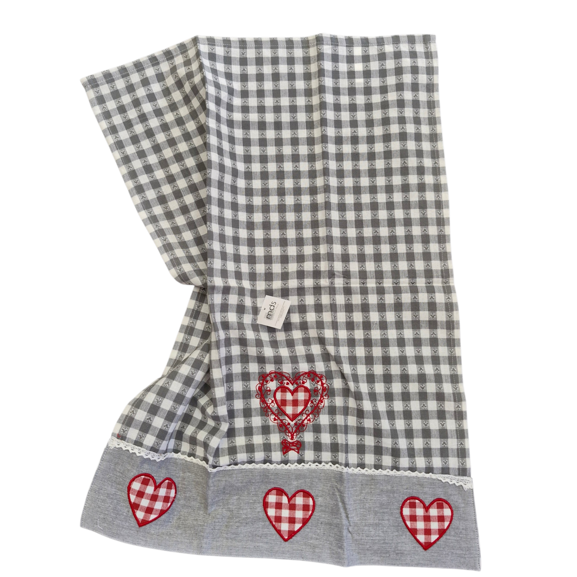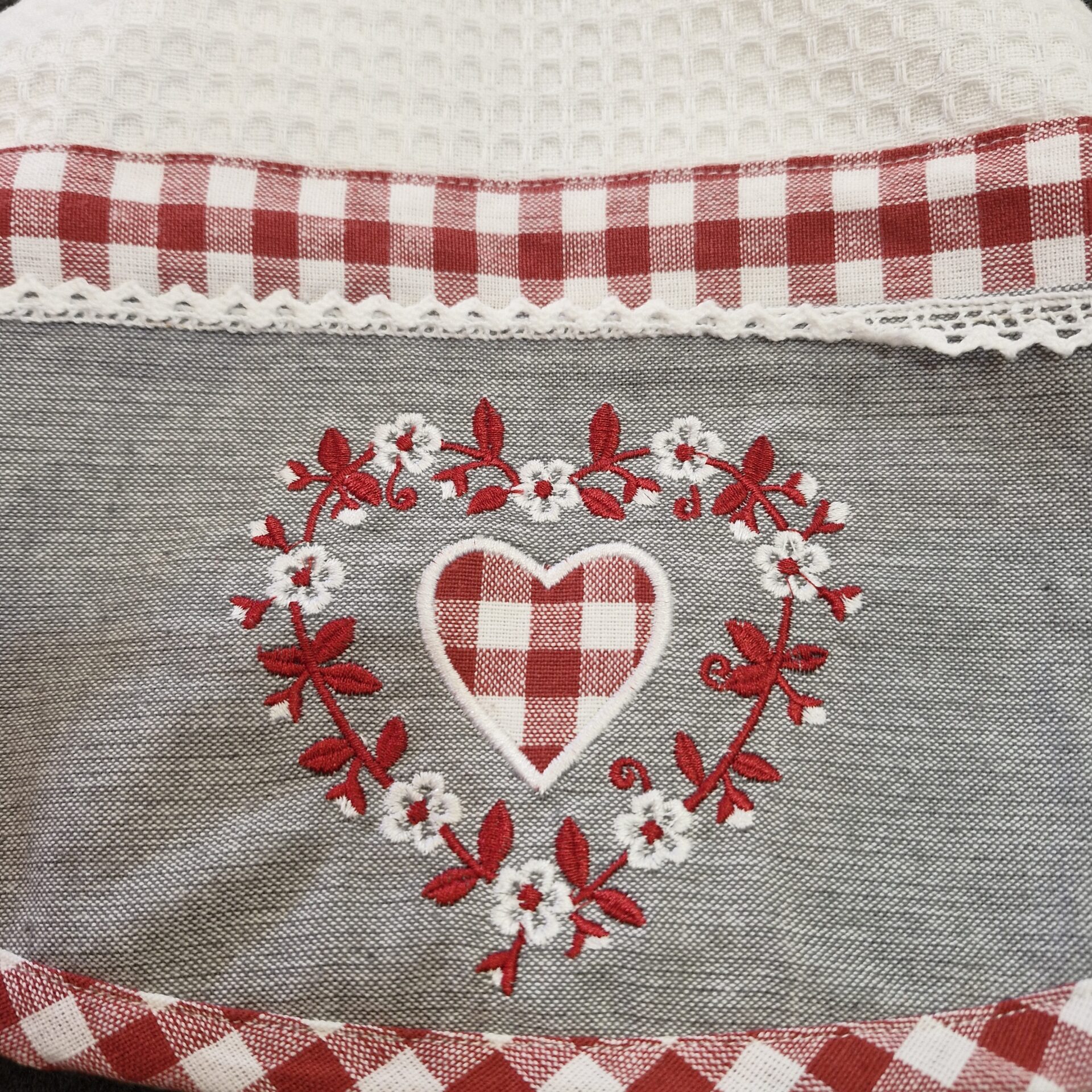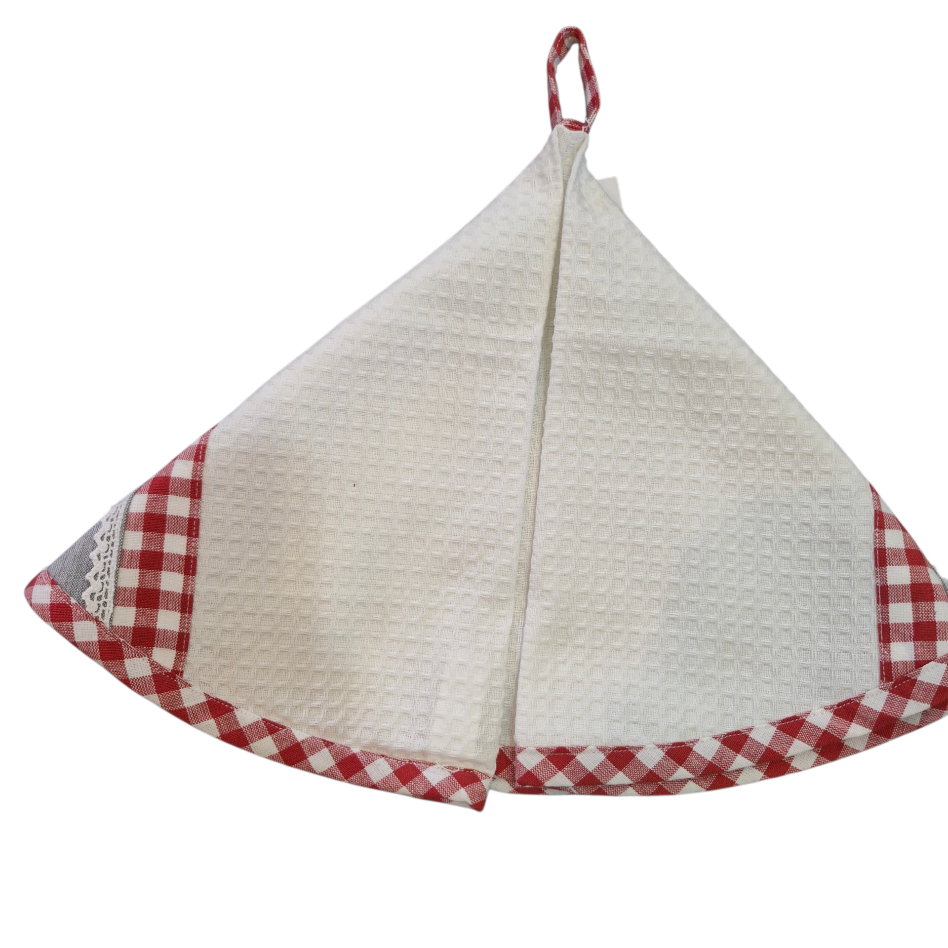 Essuie main rond Nid d’abeille blanc Couleur : blanc bordure vichy rouge Motif : coeur vichy et fleuri rouge et blanc 100% coton Fabriqué en EU