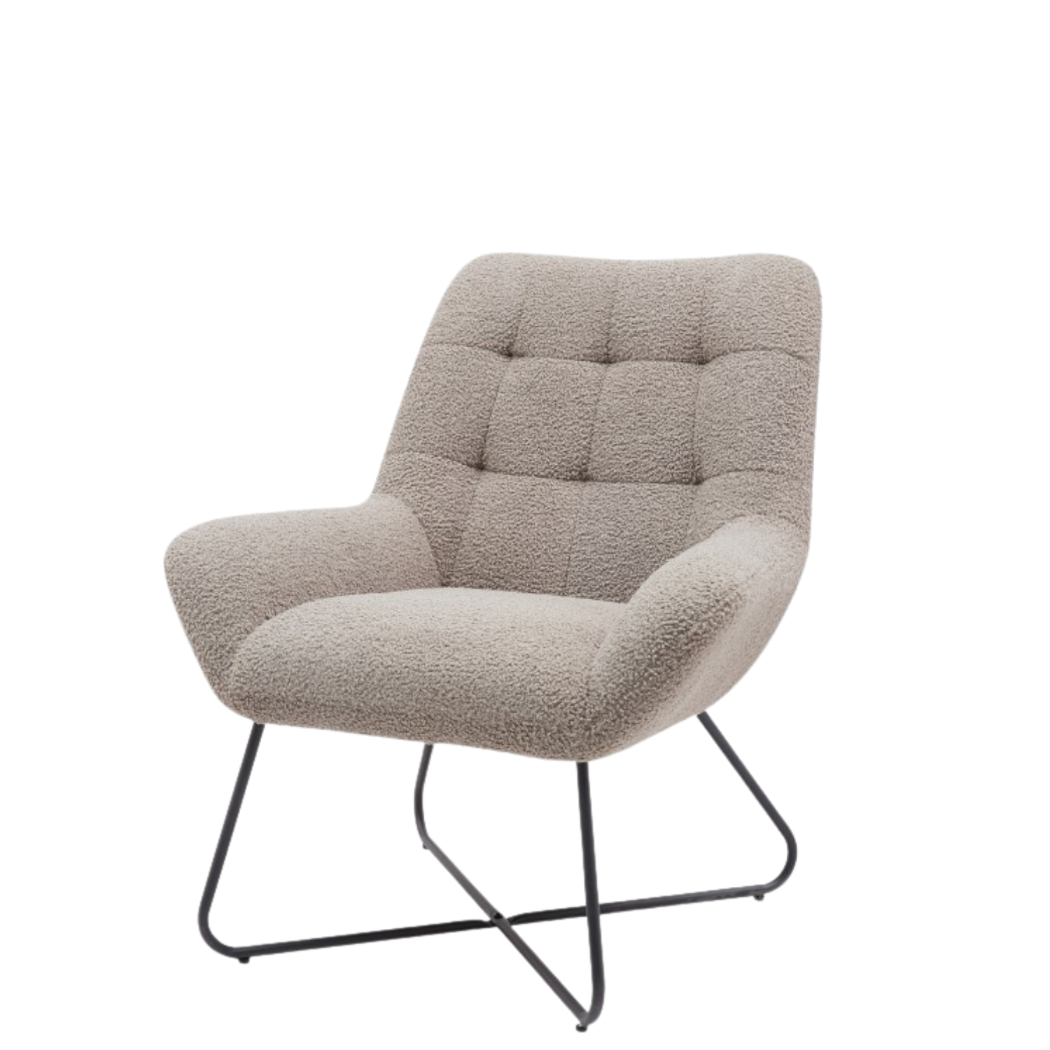 Matière Polyester Composition Structure : contreplaqué, mousse polyuréthane Revêtement : 100% polyester effet laine bouclette Pieds : métal peinture époxy noir Dimensions : L76 x P80 x H88cm