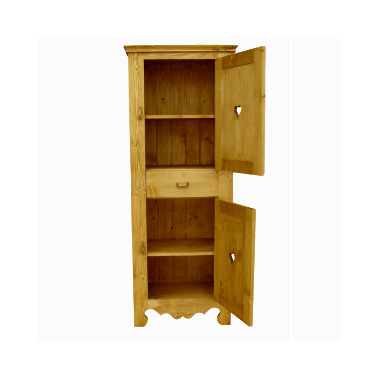 2 portes coeur à fleur (charnières métal) +1 tiroir Epicéa 100% Massif Finition Huilée L66 x P43 x H170cm Cette collection existe aussi sans coeur. Possibilité de faire du sur-mesure sur demande.
