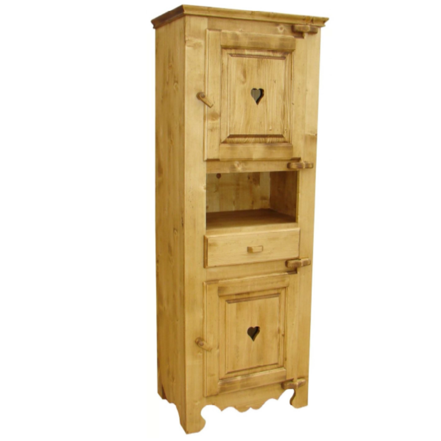 2 portes coeur charnières bois + 1 tiroir + 1 niche Epicéa 100% Massif Finition Huilée L66 x P45 x H179cm Cette collection existe aussi sans coeur. Possibilité de faire du sur-mesure sur demande.