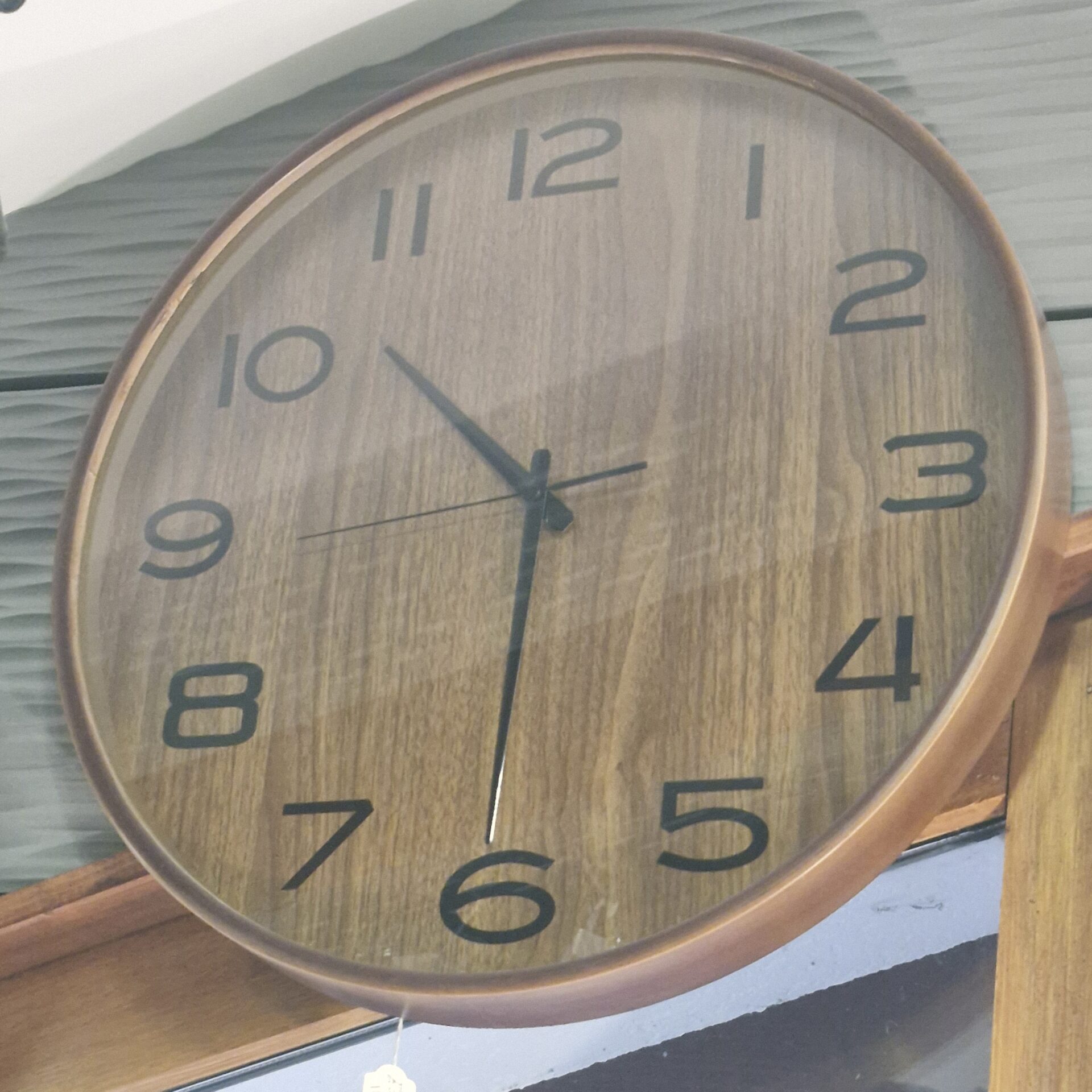 Horloge murale en bois stratifé Veines du bois apparentes Couleur marron Vitre en plexi trnasparent Diam : 53cm, épaisseur 6cm