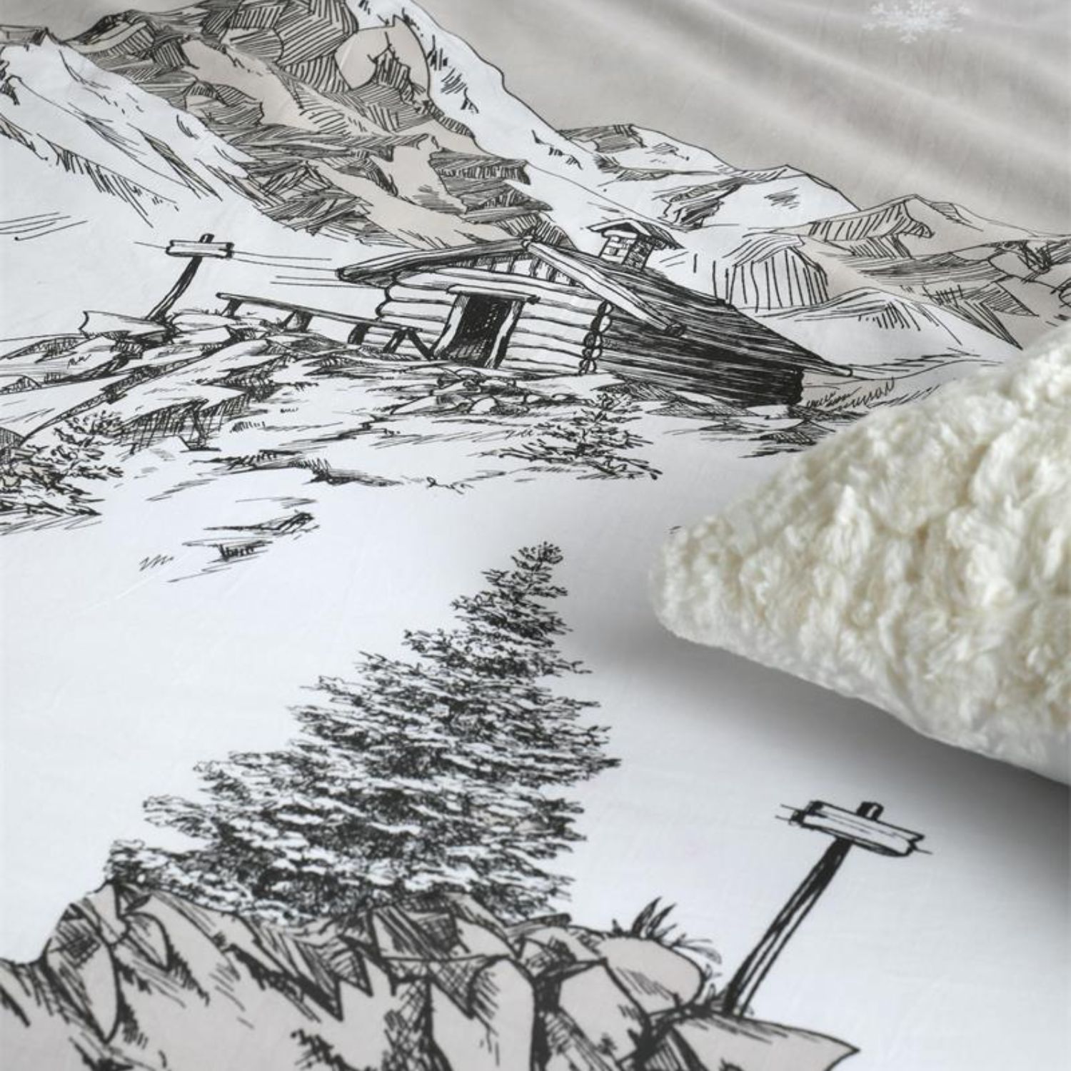 The Refuge duvet cover features a mountain scene in an elegant pencil sketch style. Its pattern depicts an alpine chalet surrounded by peaks and fir trees, all in shades of grey and white, creating a soothing and authentic atmosphere, ideal for a nature-inspired bedroom.