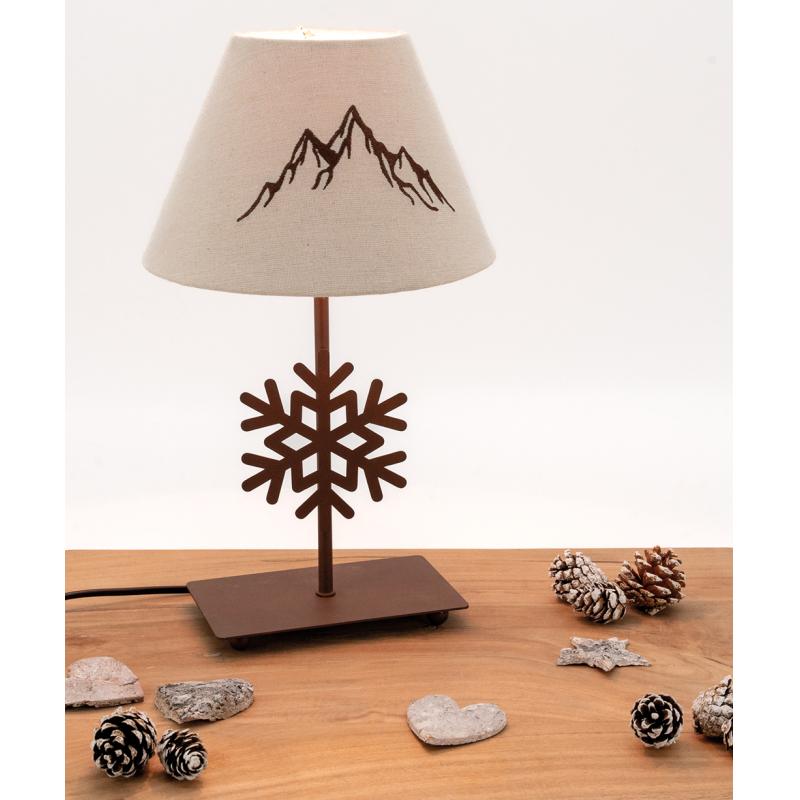Immerse your interior in a warm, wintery atmosphere with this decorative metal lamp, featuring a finely crafted snowflake-shaped base and a beige lampshade adorned with brown mountains. Elegant and original, it evokes the spirit of Alpine chalets, combining mountain freshness with indoor comfort.