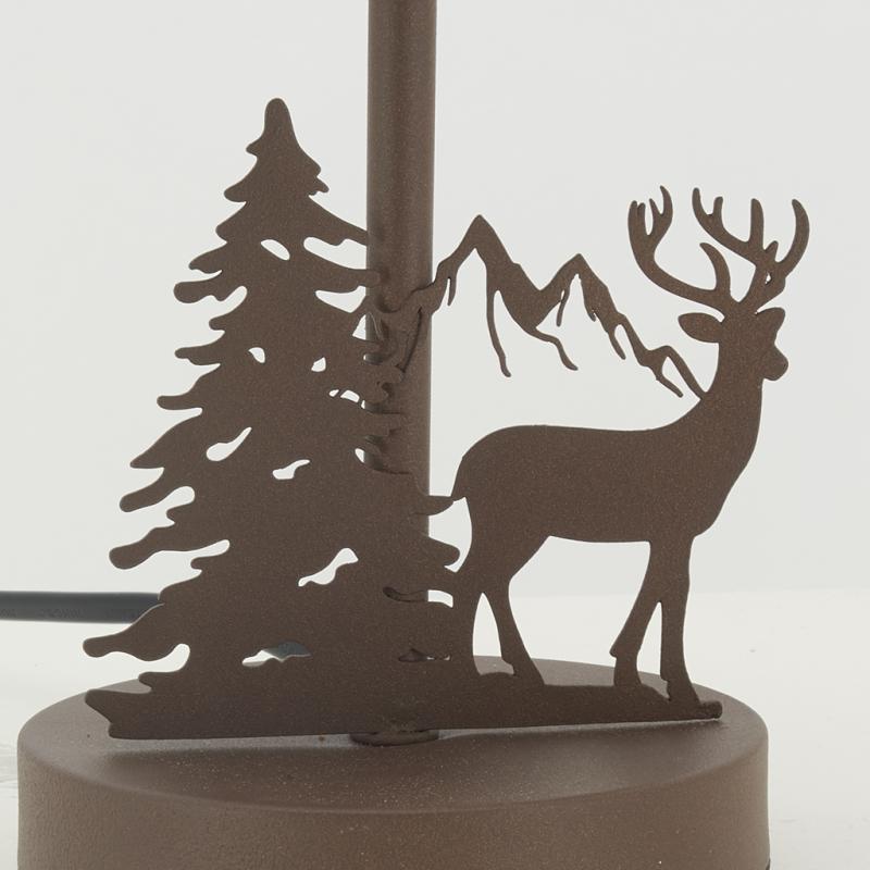 Lampe en métal avec abat-jour en coton noir. Base marron décor cerf et montagne. Livrée avec équipement électrique. Compatible ampoule E14 Dim : 20x34cm