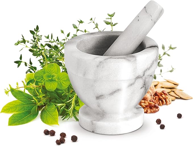 With the Spicy White Mortar, you are not only adding a practical tool to your kitchen, but also a real decorative element. This small mortar and pestle are made of high-quality white marble, offering a luxurious appearance and great durability. Whether you are crushing spices to release all their flavours or looking for an aesthetic piece for your kitchen, this mortar is for you.