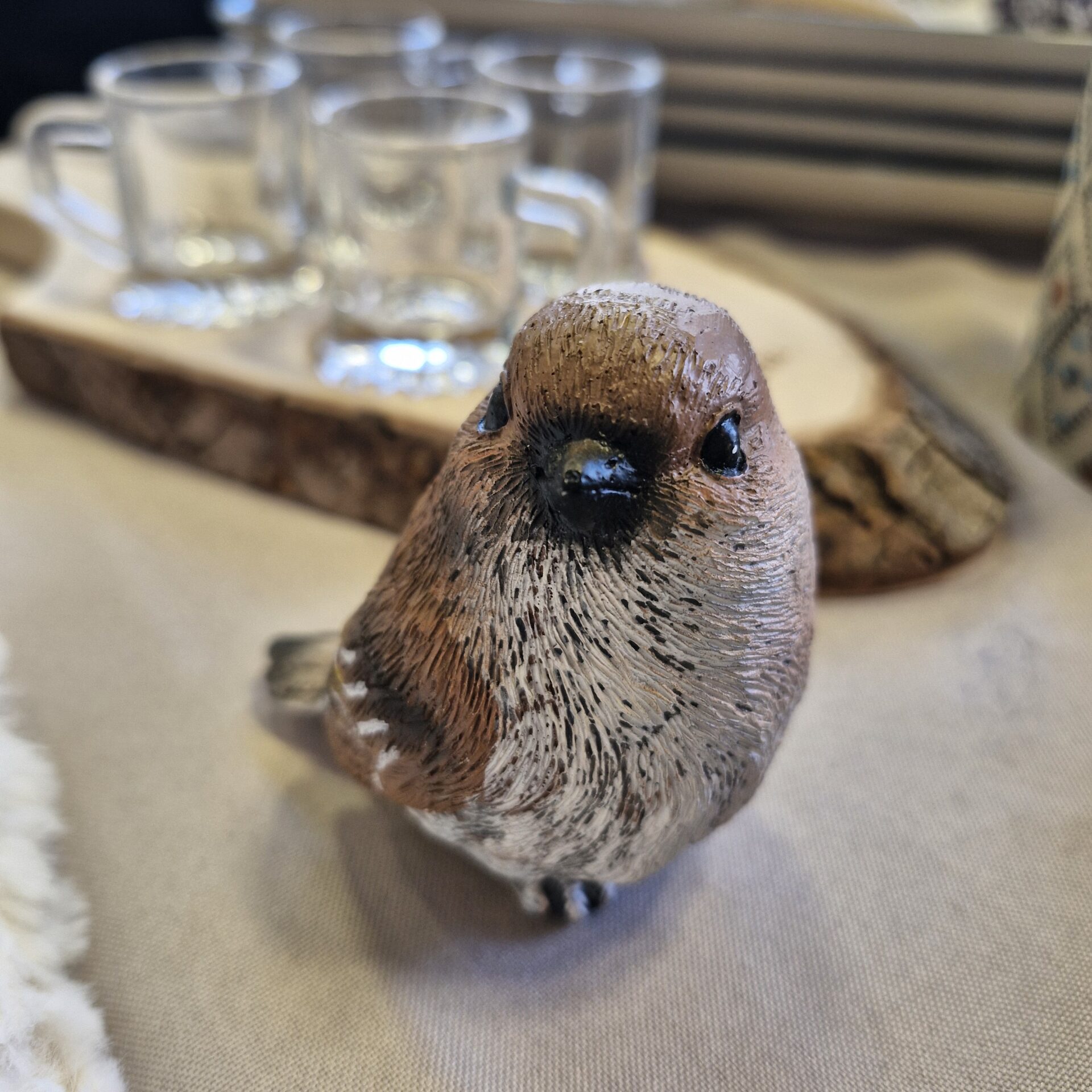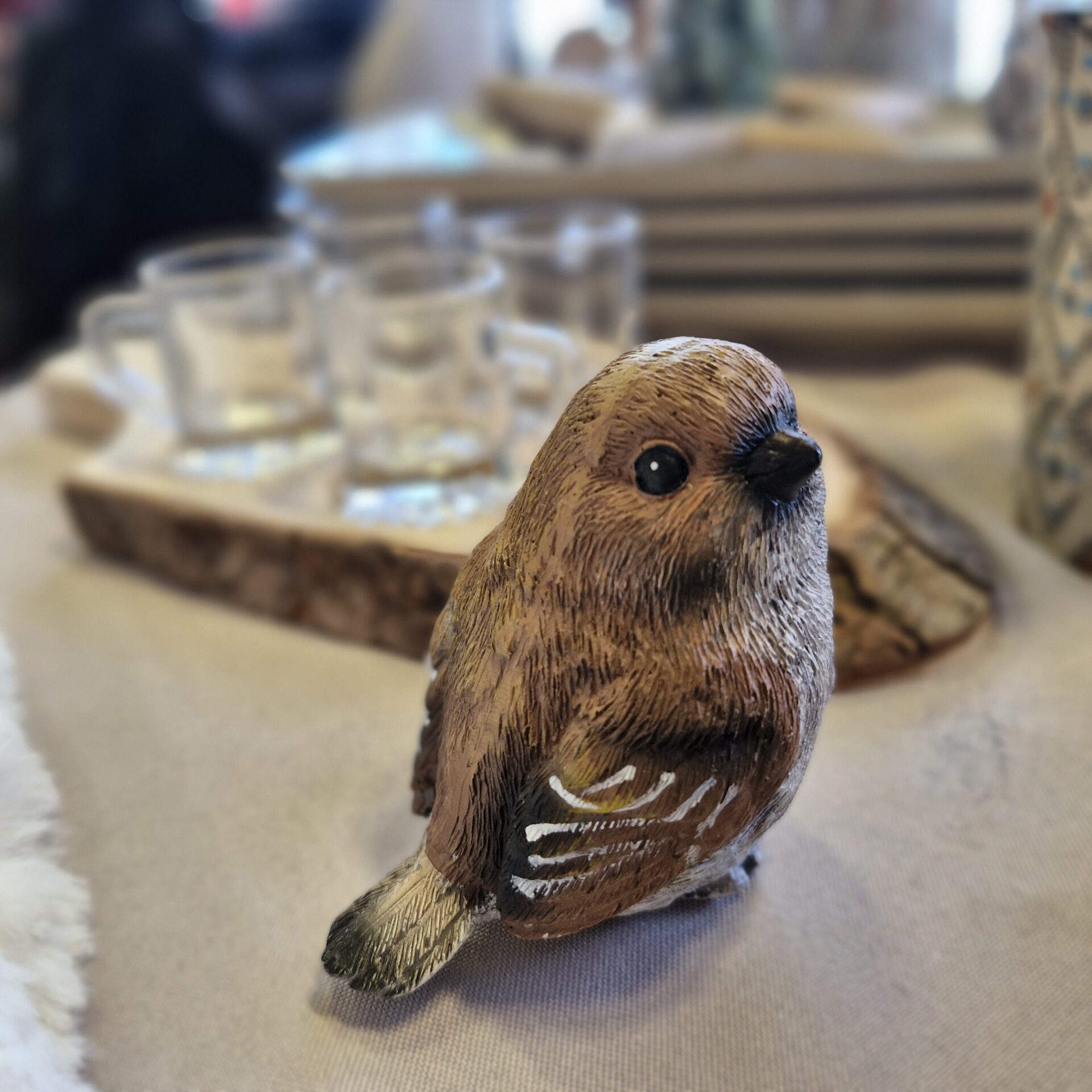 Small, delicate model, dimensions suitable for a shelf, windowsill or table. Resin material. Natural brown and beige colours, soft and warm tones for a realistic and cosy atmosphere. Precisely sculpted details, textured plumage and expressive eyes for an elegant look. Lightweight and stable, easy to move or position to suit your décor. Natural and timeless style, compatible with a variety of decorative styles: rustic, Scandinavian, modern or country.