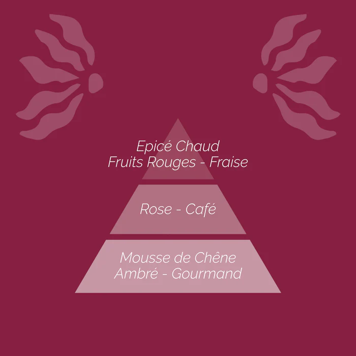 Notes d’ambre gourmand, rose, café, épice, fruits rouges et fraise