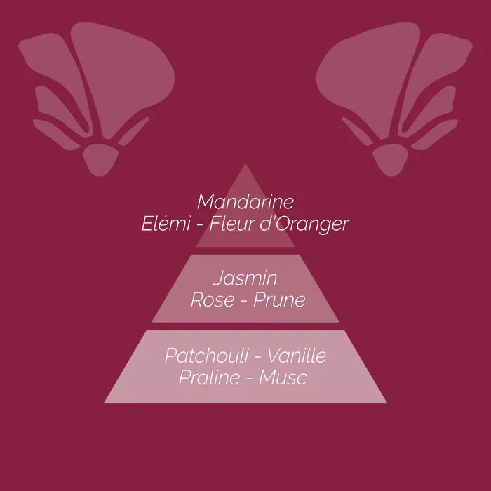 Aux notes de patchouli, vanille, praliné, musc, jasmin, rose, mandarine, fleur d’oranger