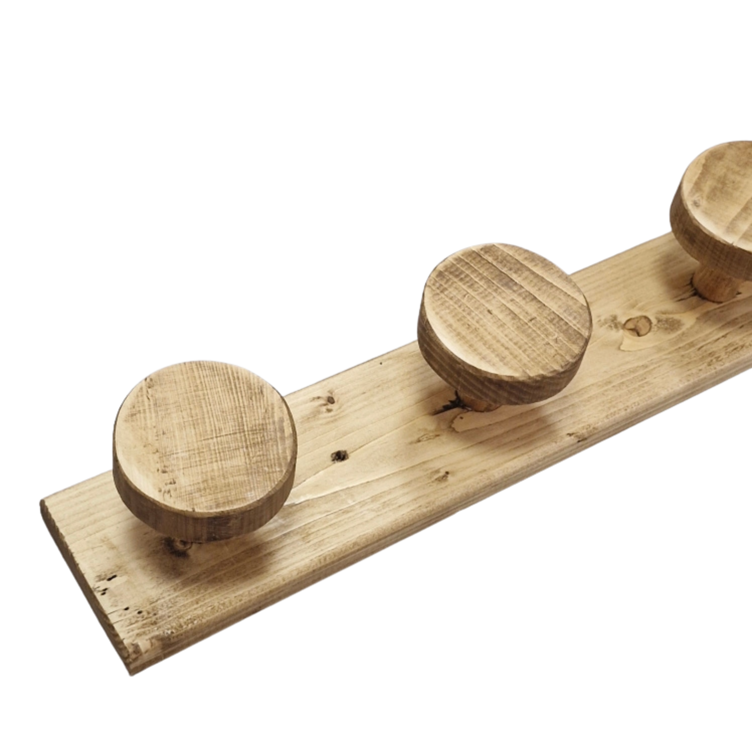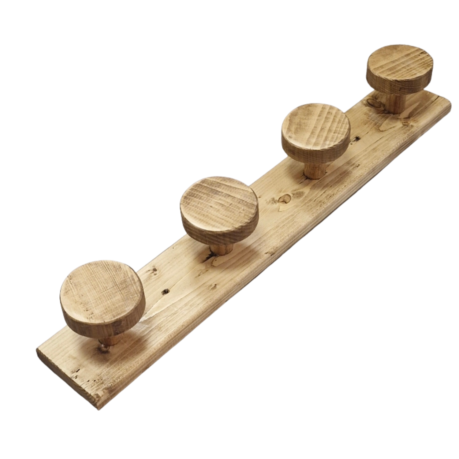 Patère murale en bois ciré avec 4 têtes rondes pour vêtements, sacs, accessoires ou torchons.